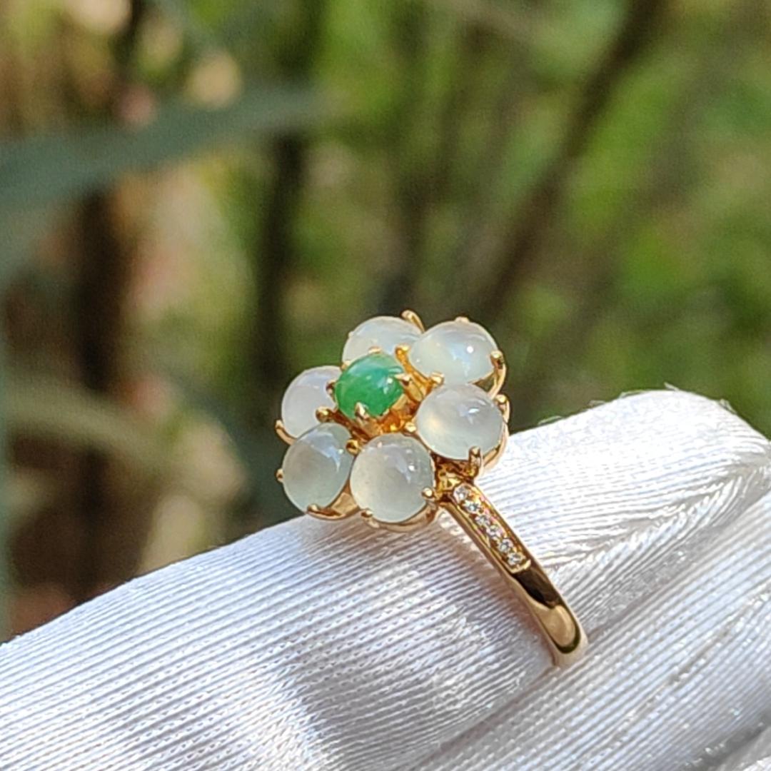 This exquisite ring is a must-have for any jewelry collection. Made of natural type A jadeite, this ring features six beautiful icy cabochon stones with good translucency, set in G18k gold. The stones are arranged in a stunning flower design, with one green cabochon as the center piece.