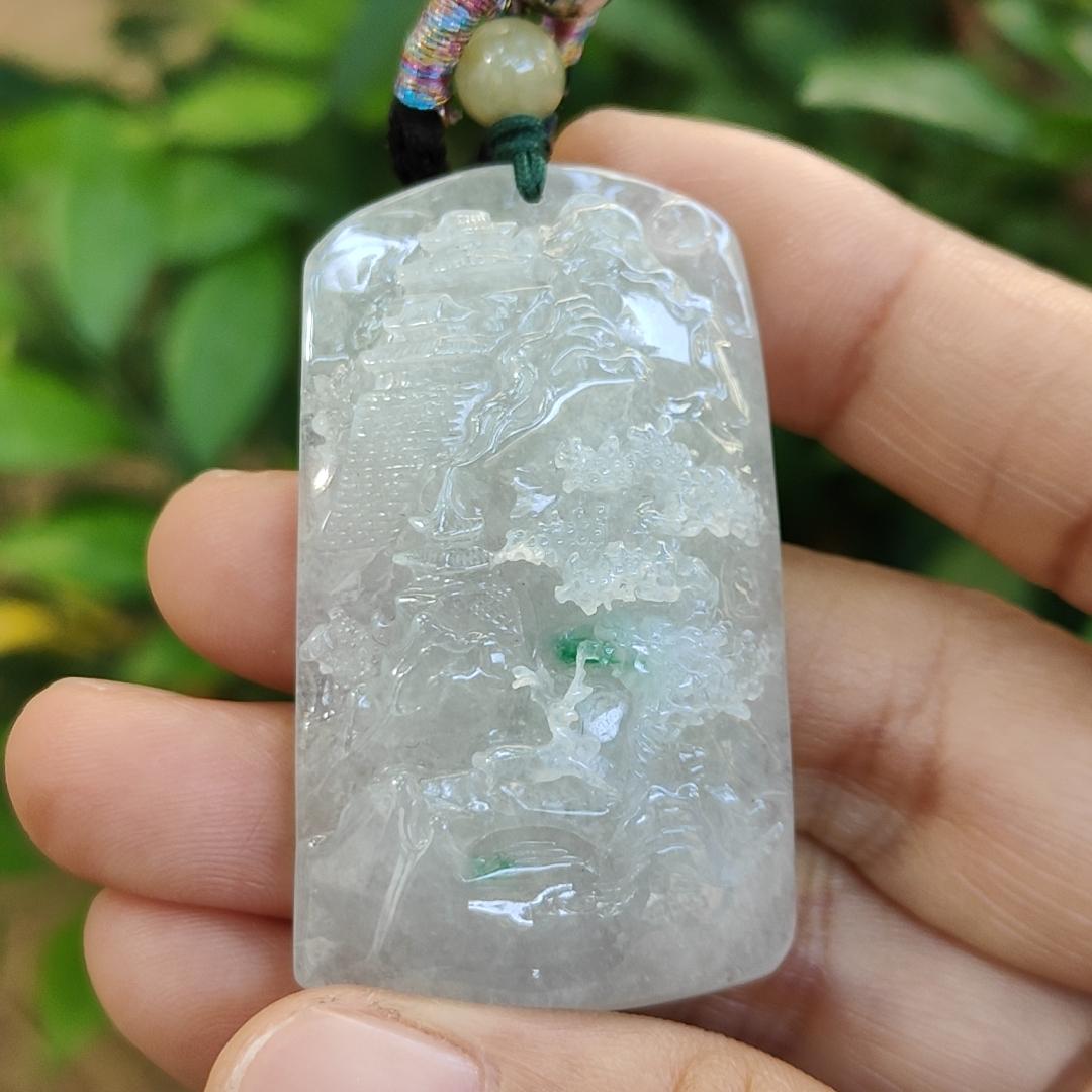 Este exquisito colgante presenta jadeíta tipo A verde claro translúcido de alta calidad con hermosas manchas verdes, elaborado con un diseño escénico.