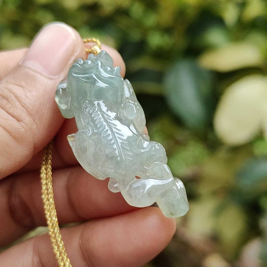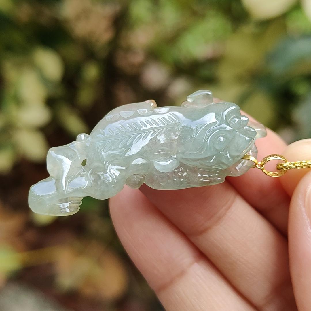 Este exquisito colgante Pixiu está elaborado en jade jadeíta natural tipo A y cuenta con un elegante cierre de oro de 18 k, creando una impresionante pieza de joyería.