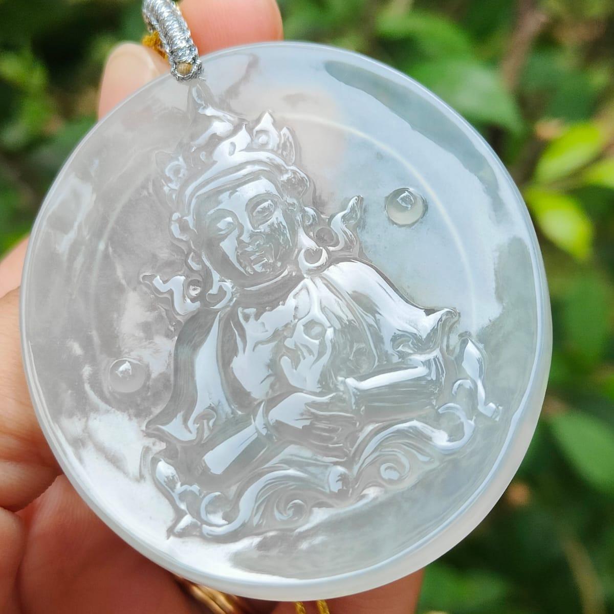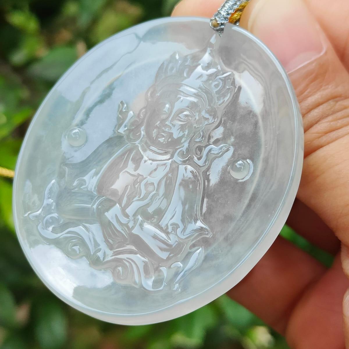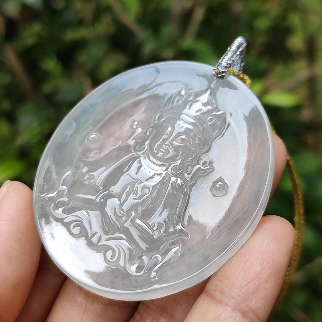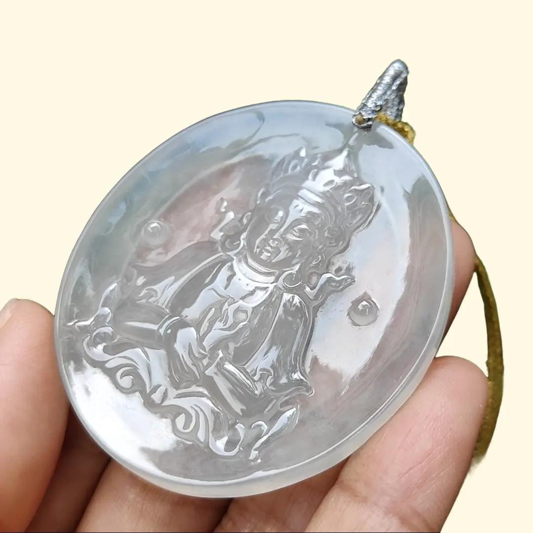 Este colgante de jade Guanyin súper raro es parte de un Colección antigua #2, elaborado a partir de jadeíta natural tipo A altamente translúcido con certificado. Pesa 24,35 gramos y medidas 52,3 x 46,3 x 4,3 mm.