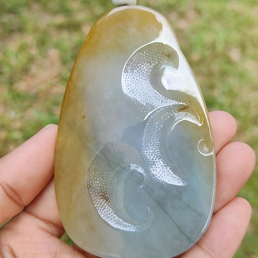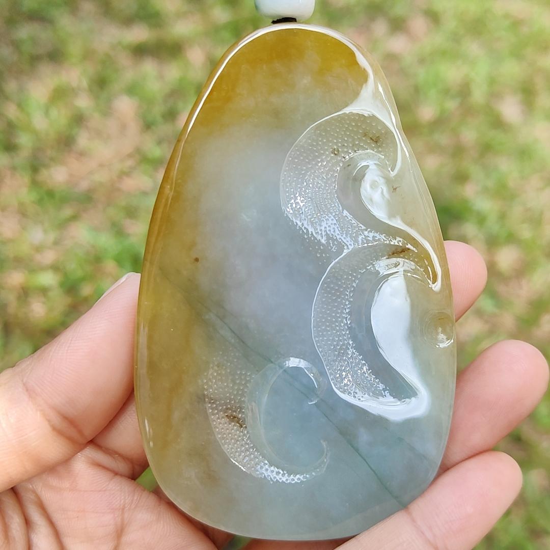 Ce pendentif exquis est composé de jade jadéite naturel de type A vert clair, jaune brun et rouge de haute qualité Hugh, méticuleusement fabriqué en Guanyin. Le pendentif est accompagné d'un certificat et pèse 79,47 grammes, avec des mesures de 83,3 * 52,6 * 8,5 mm.