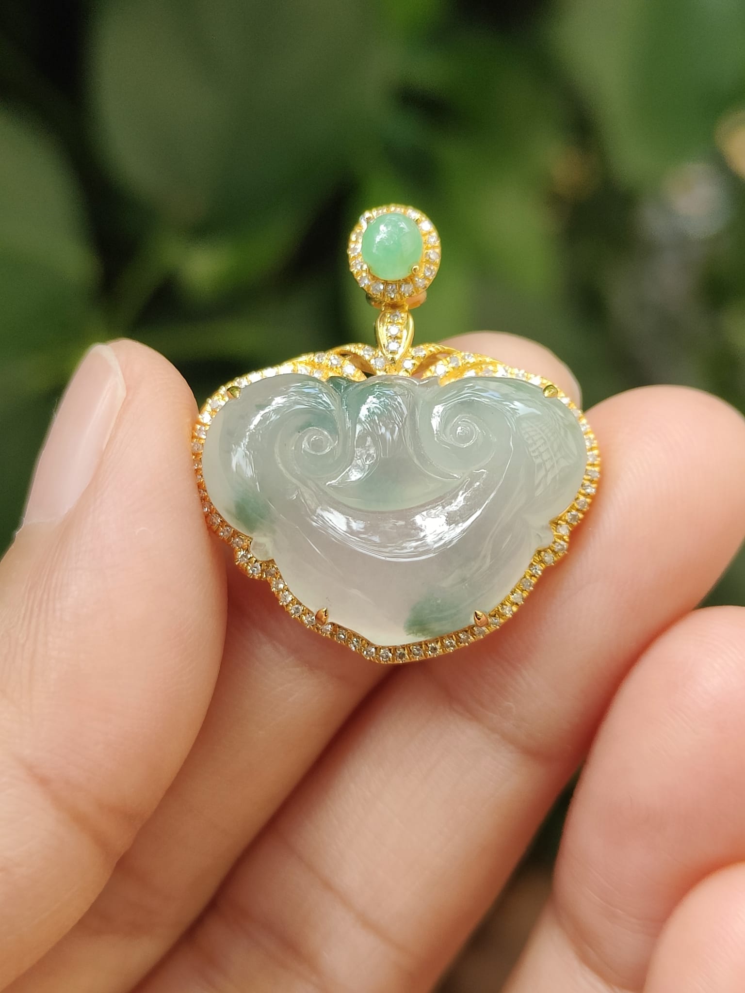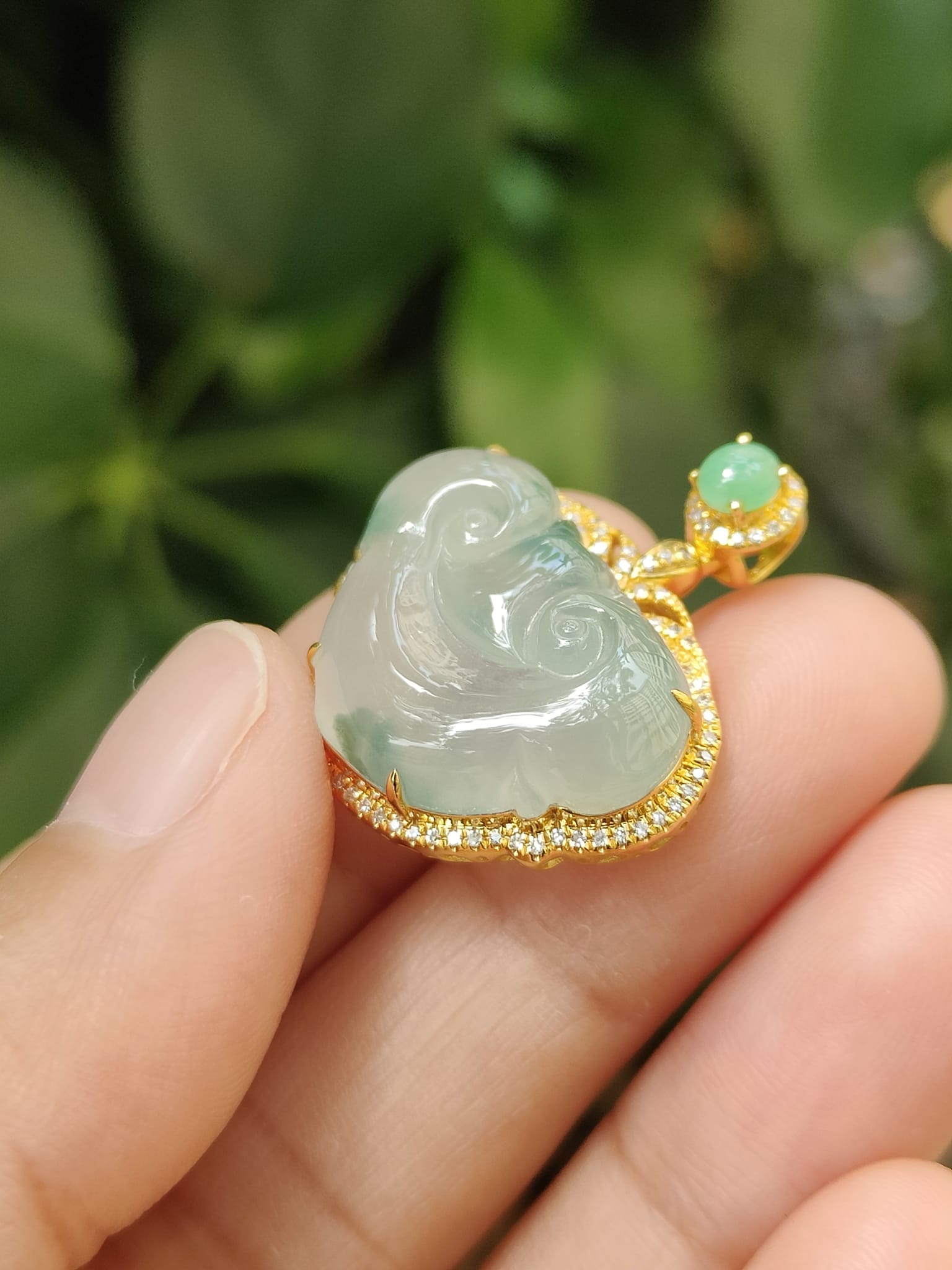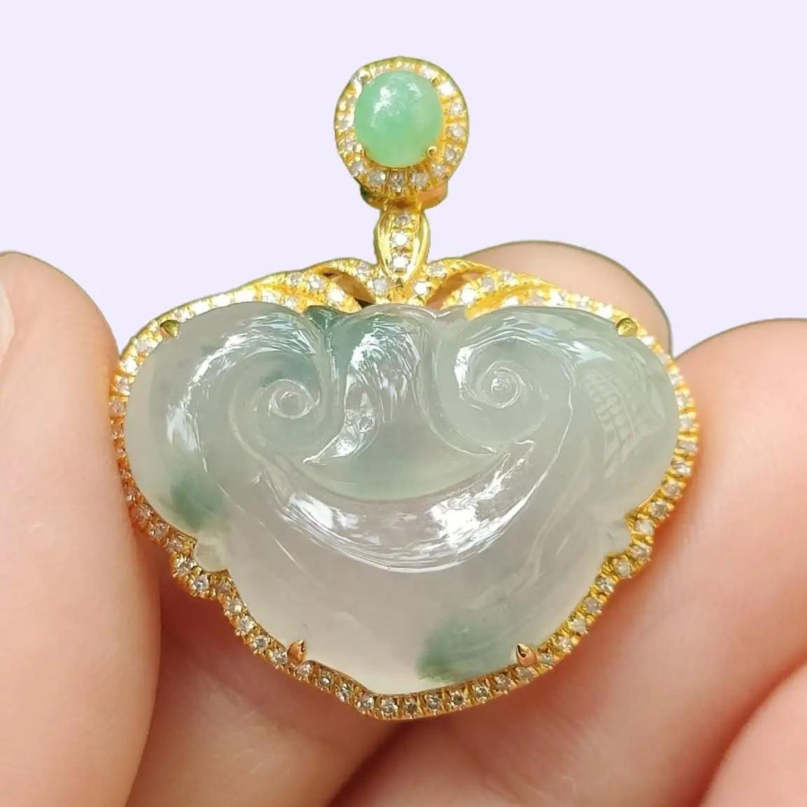 Ce nouveau produit arrivé à Singapour est un pendentif en or 18 carats en jade jadéite naturelle de type A de qualité supérieure fabriqué par Ruyi. Il est livré avec un certificat et pèse 5,51 grammes avec des mesures de 27,1 * 24,6 * 7,3 mm (18kp74).
