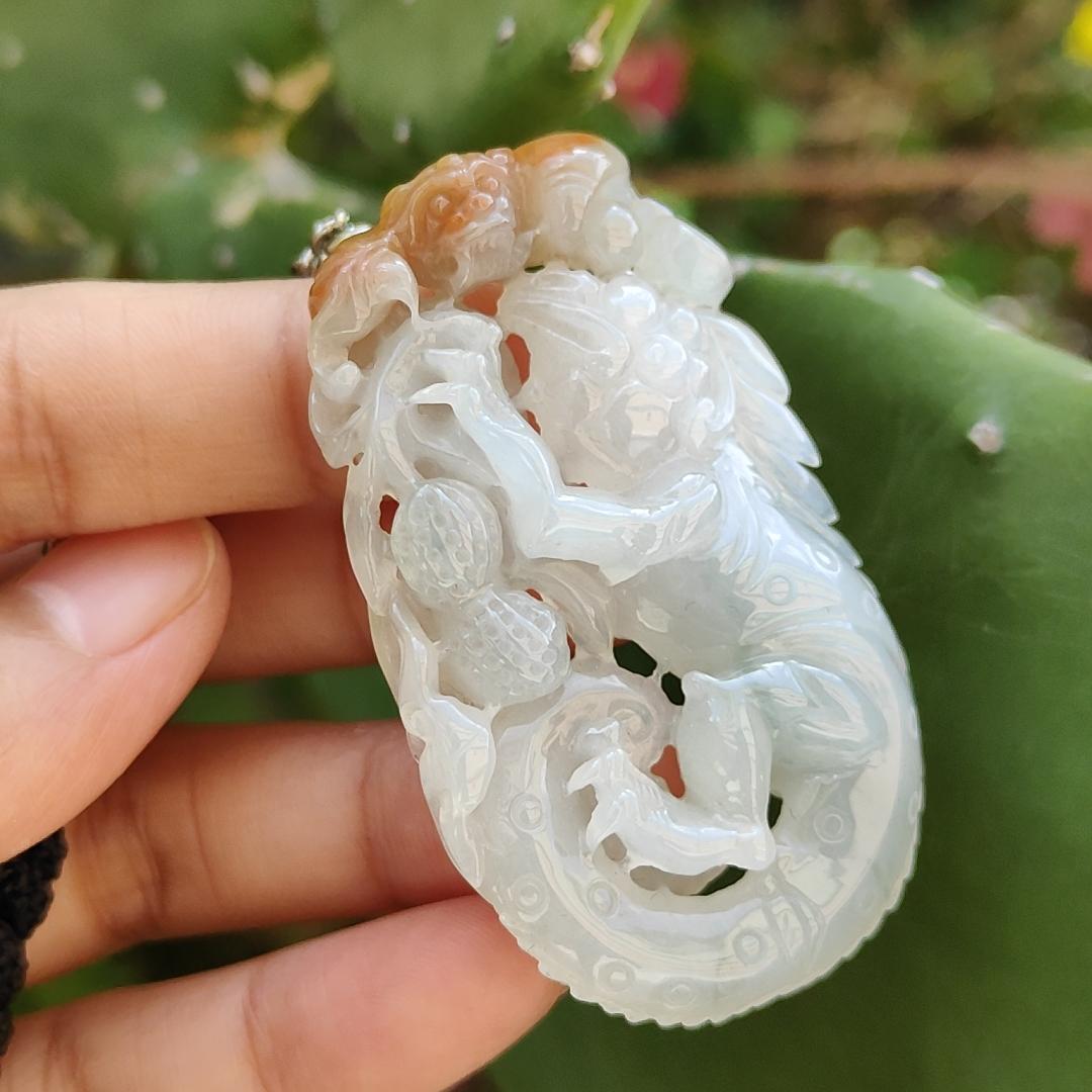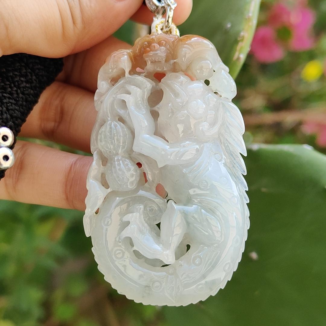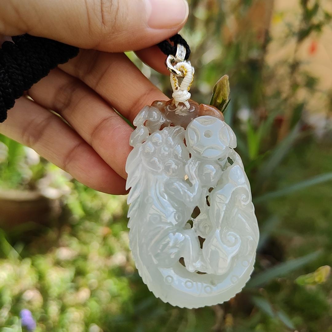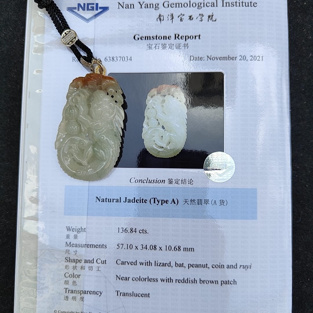 Liontin Jadeite Tipe A Alami ini merupakan perhiasan yang menakjubkan dan wajib dimiliki oleh para kolektor. Dibuat di Myanmar, liontin ini menampilkan ukiran indah berupa kadal, kelelawar, kacang, koin, dan ruyi. Liontin ini memiliki berat 136,84 gram dengan dimensi 57,10 * 34,08 * 10,68 mm dan memiliki tampilan hampir tidak berwarna dengan bercak-bercak cokelat kemerahan.