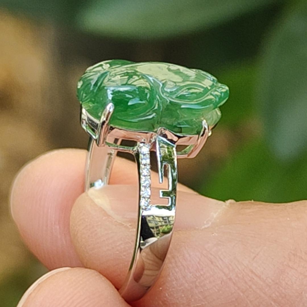 This exquisite Green Pixiu ring is crafted from Natural Type A Jadeite Jade, elegantly set in 18k gold. With a measurement of 13.2 * 7.9 * 4.5 mm, it is designed for a finger size with a diameter of 16.2 mm.