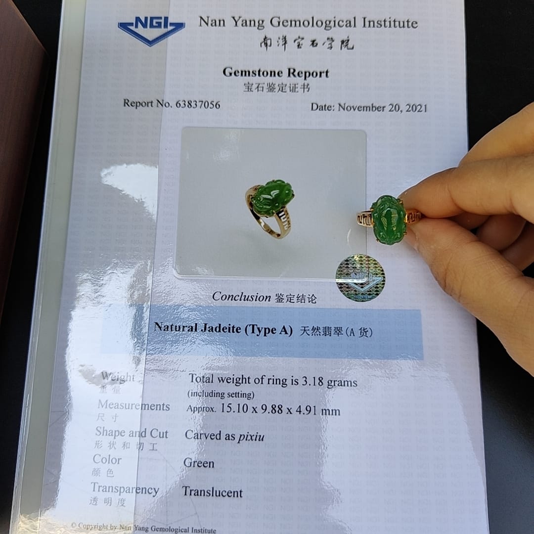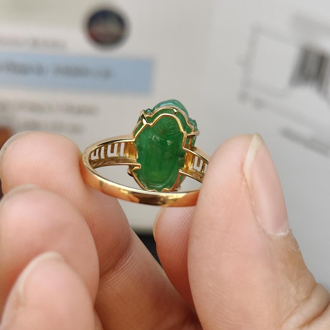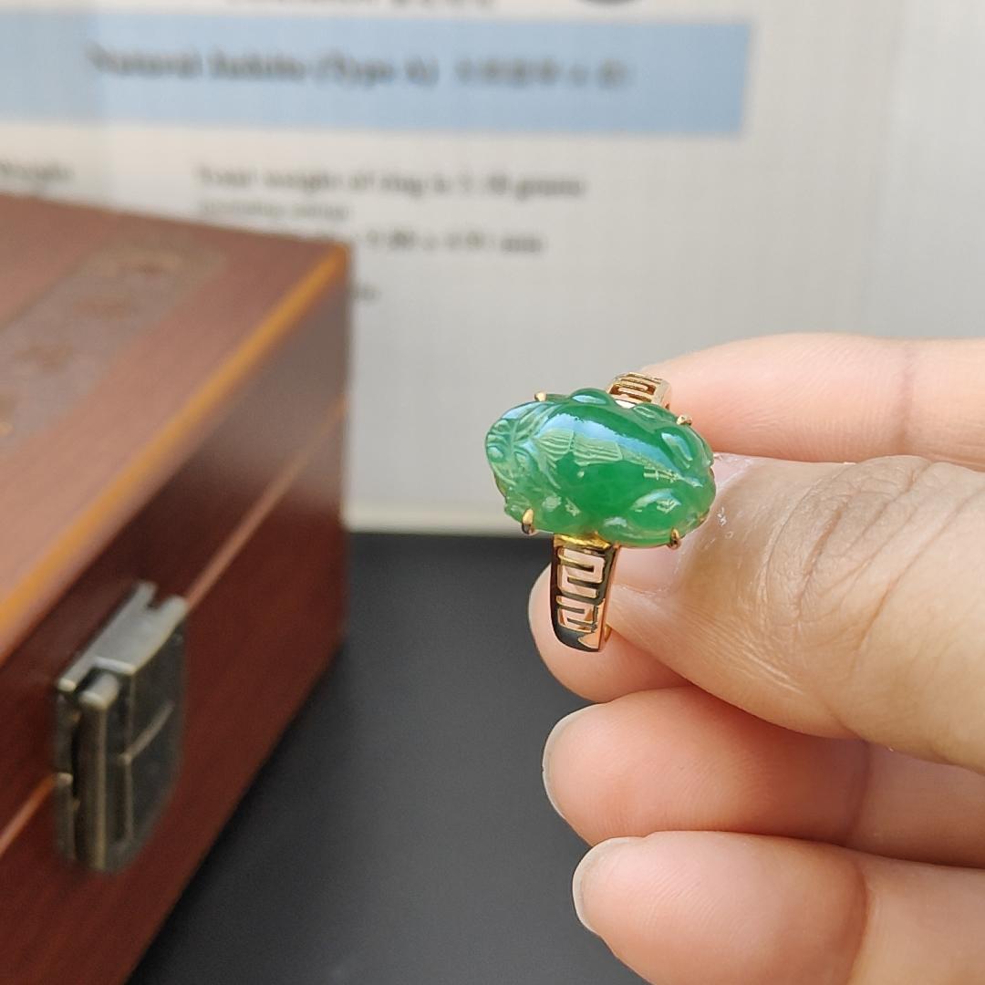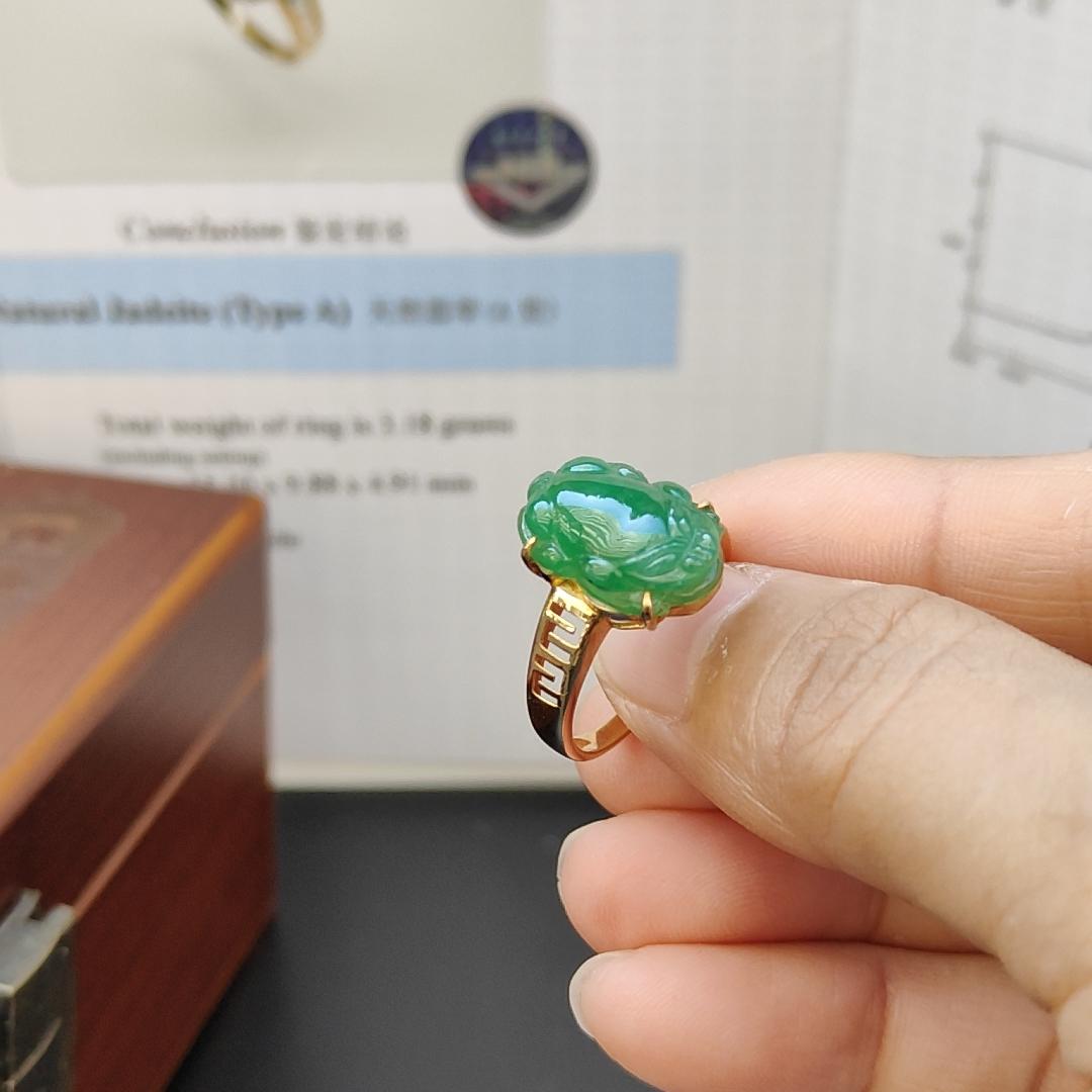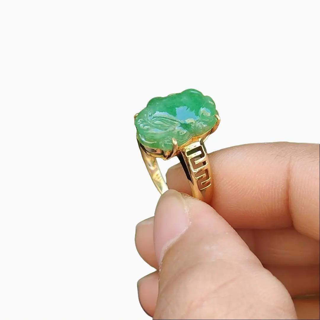 이 놀라운 18k 골드 그린 반투명 미세 입자 Pixiu Natural Type A Jadeite Ring으로 보석 게임을 한 단계 업그레이드하세요. NGI Gemstones 보고서가 제공되는 이 반지는 무게가 3.18g이고 크기가 15.10 * 9.88 * 4 .91mm인 스테이트먼트 피스입니다.