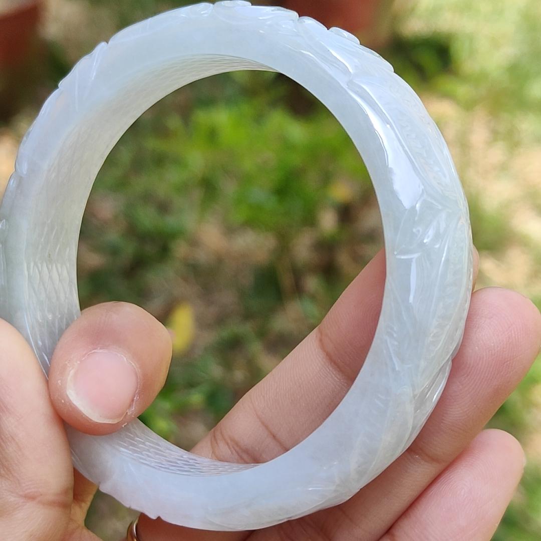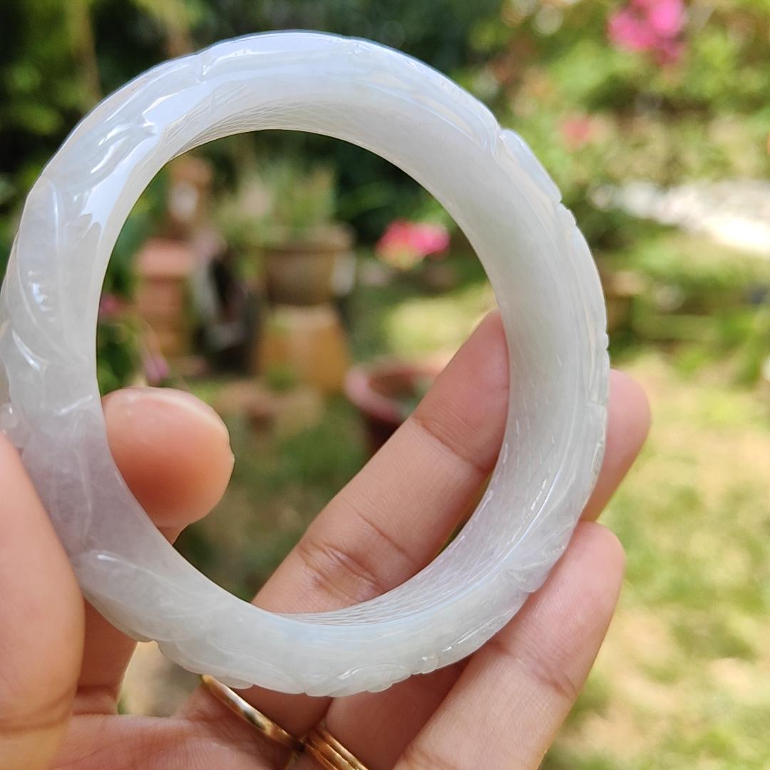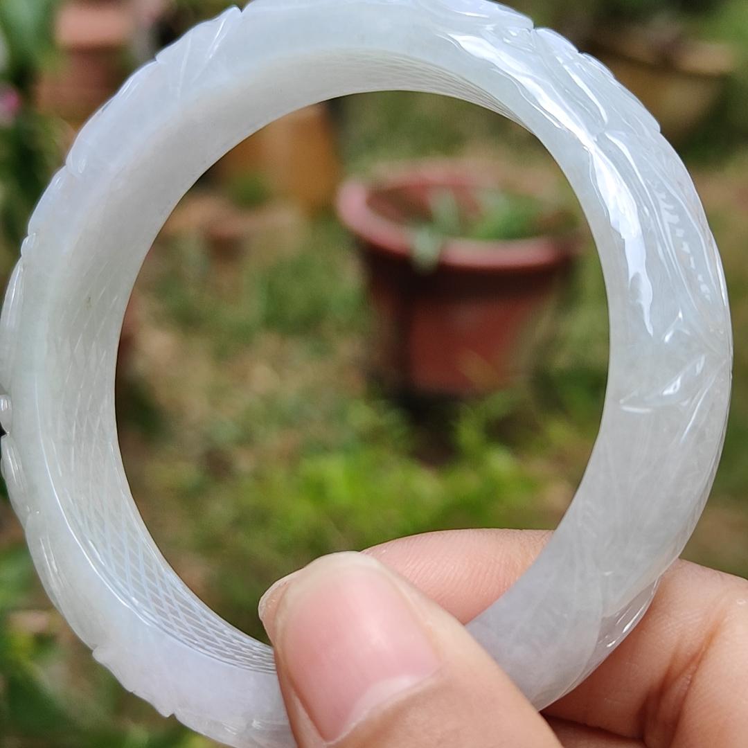 이 라이트 라벤더 천연 A형 제이드 제이드 팔찌는 섬세한 꽃 무늬가 특징이며 평화 팔찌 모양인 멋진 보석입니다. 팔찌의 무게는 60.82그램 그리고 측정 14 * 8.6mm, 팔찌 손목 사이즈 56.5mm (56.5mm).