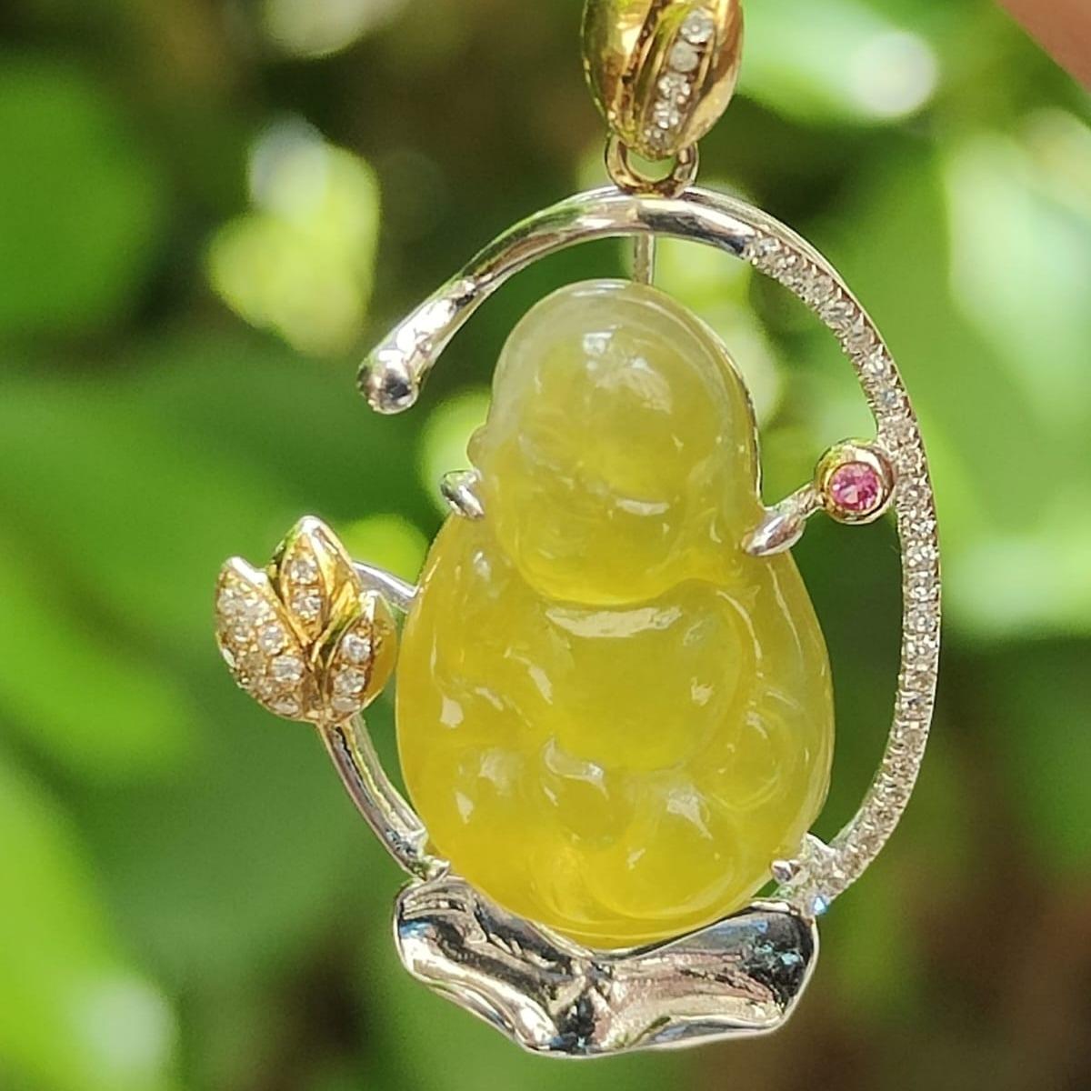 18K Gold Set Laughing Buddha Jade Pendant – ⛰💧🔩🌍🔥
