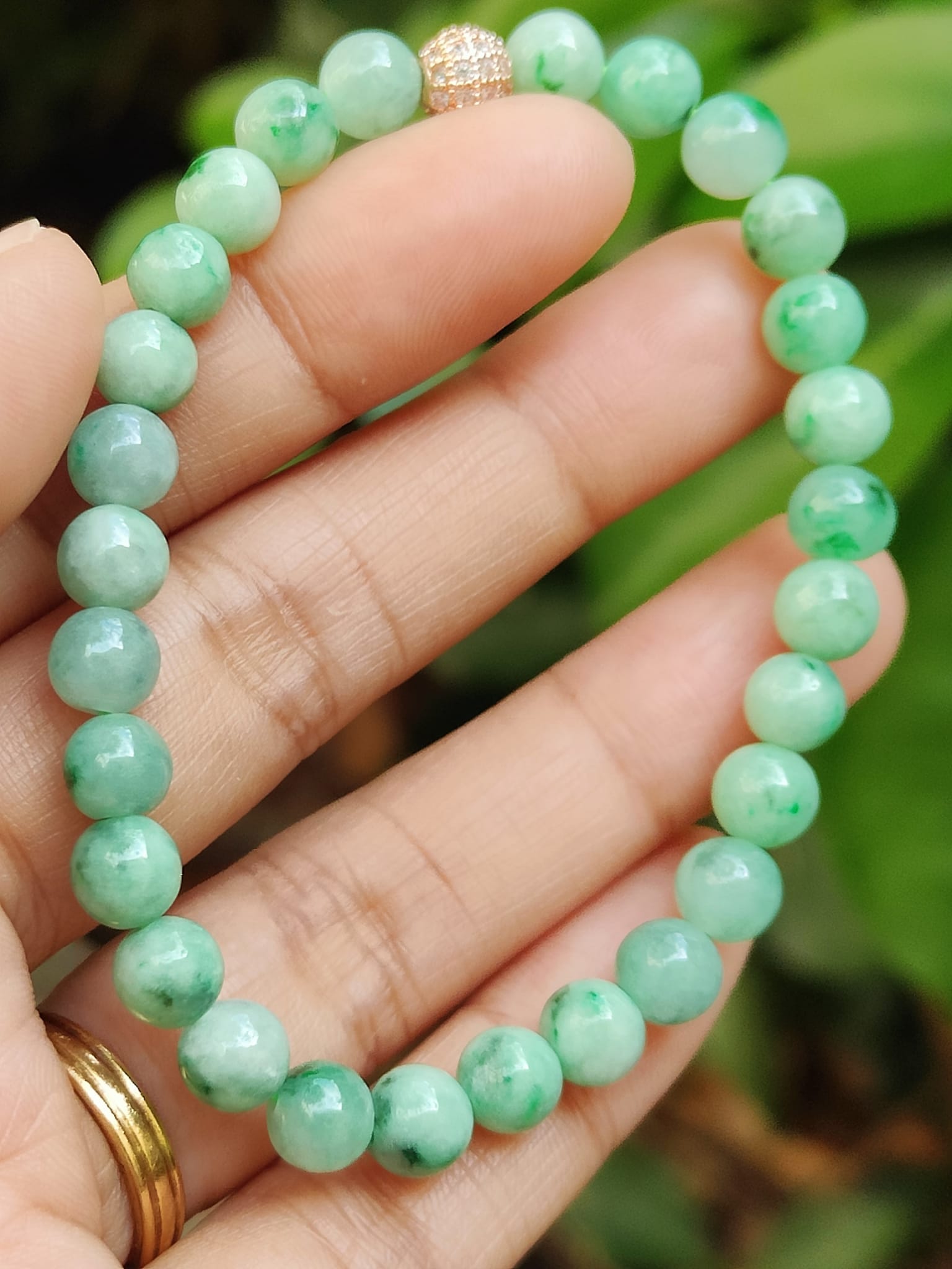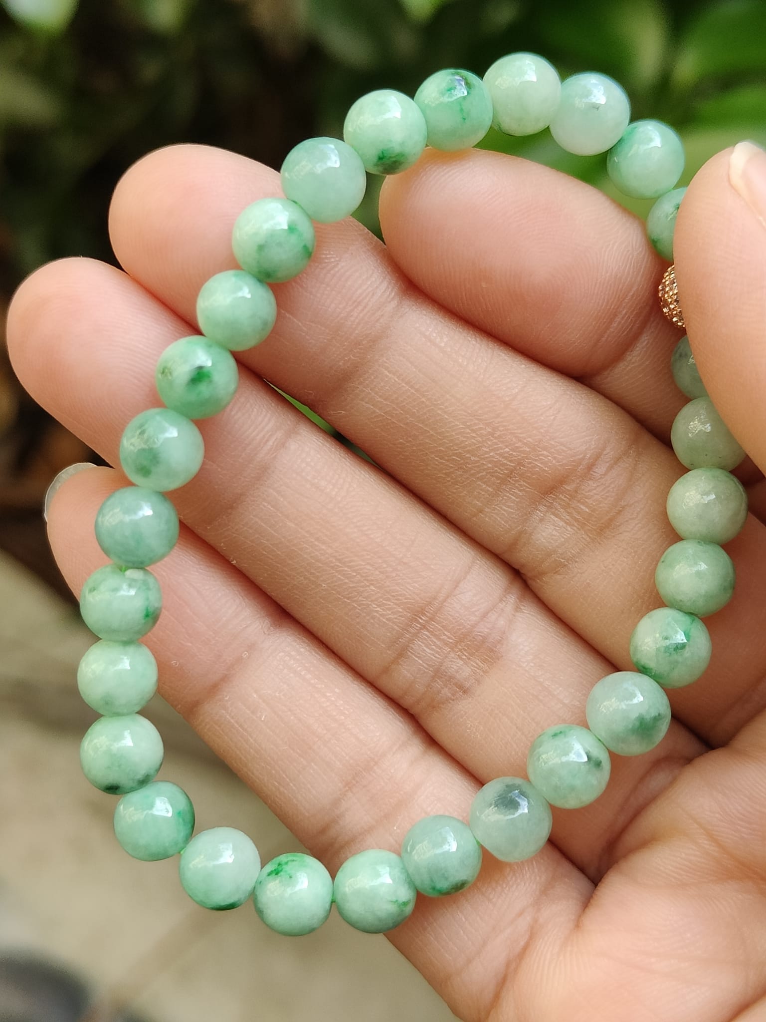 Discover the elegance of our Natural Type A Jadeite Jade bracelet, featuring beautiful light green beads with captivating green patches.