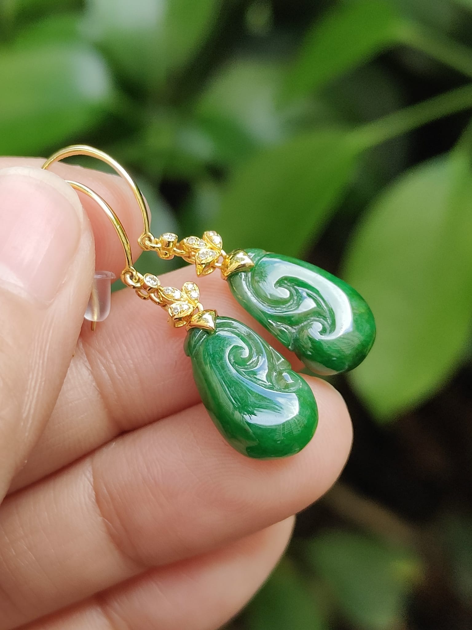 “Each earring is a miniature masterpiece: 35mm of meticulously carved jadeite, its verdant hues echoing the lush valleys of Myanmar. The 1.13 grams of 18k gold, set with 14 glittering diamonds, are not mere accents but celestial guideposts—tiny stars to illuminate your path. Weighing just 3.26 grams, they grace your ears with the weight of intention, not burden.”
