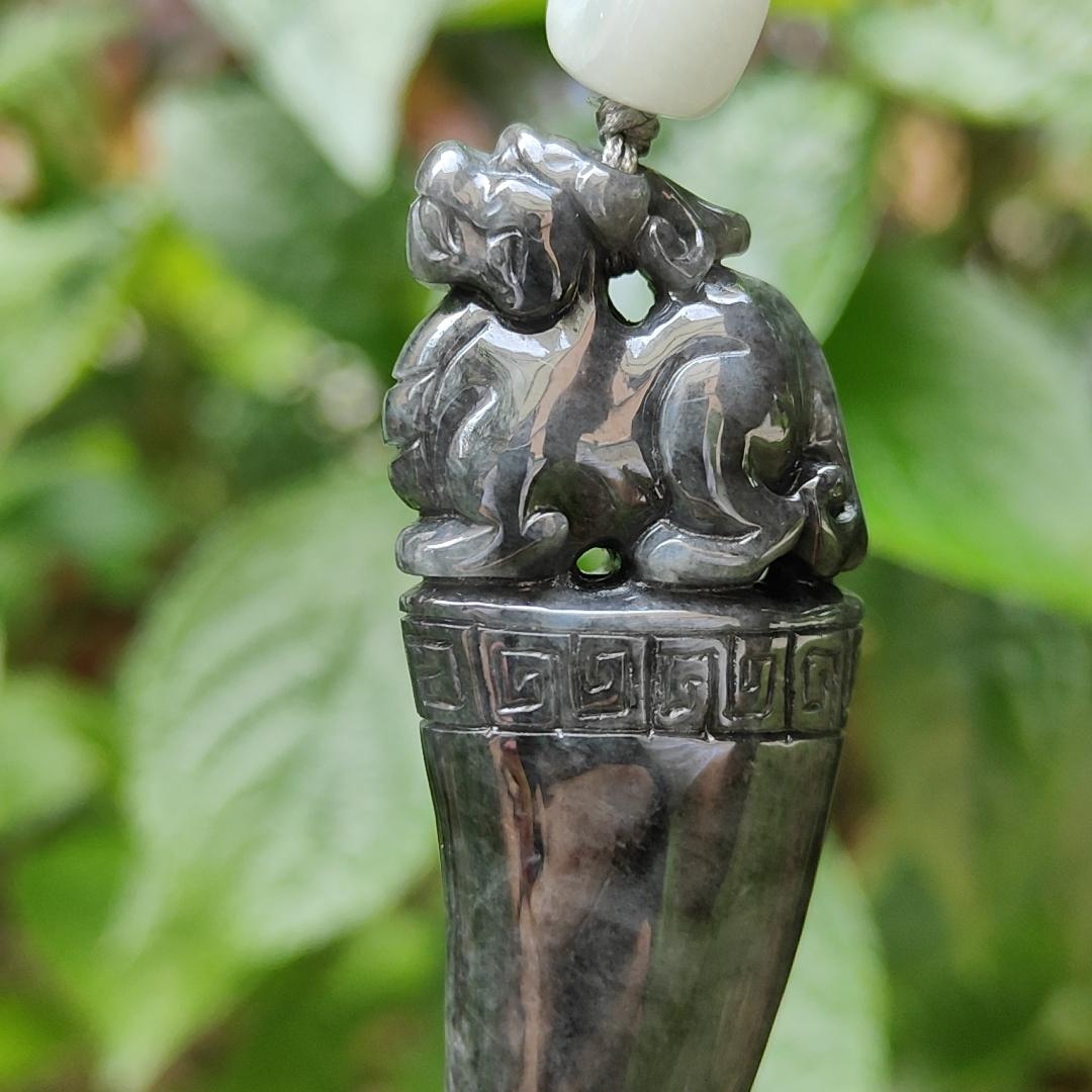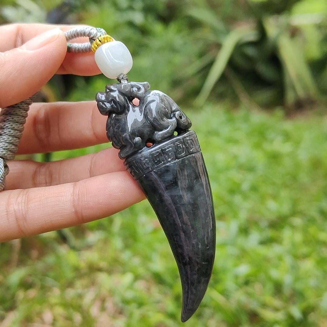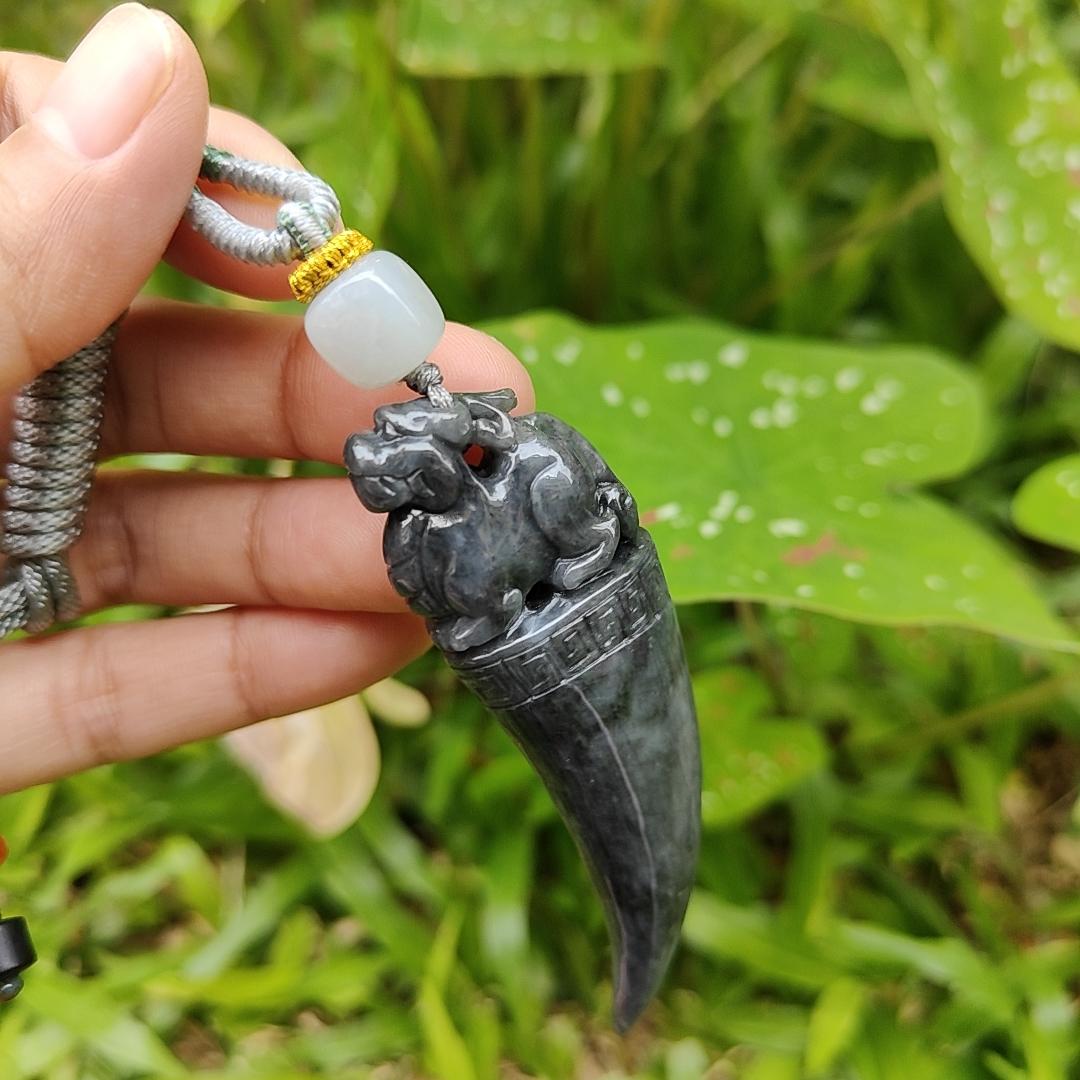 The casual necklace style makes it perfect for daily wear; add this stunning Black Wuji Natural Type A Jadeite Pendant Carved with Dragon Teeth plus Pixiu to your collection today!