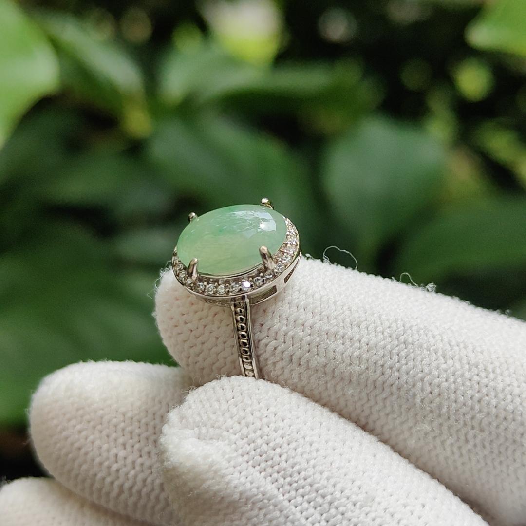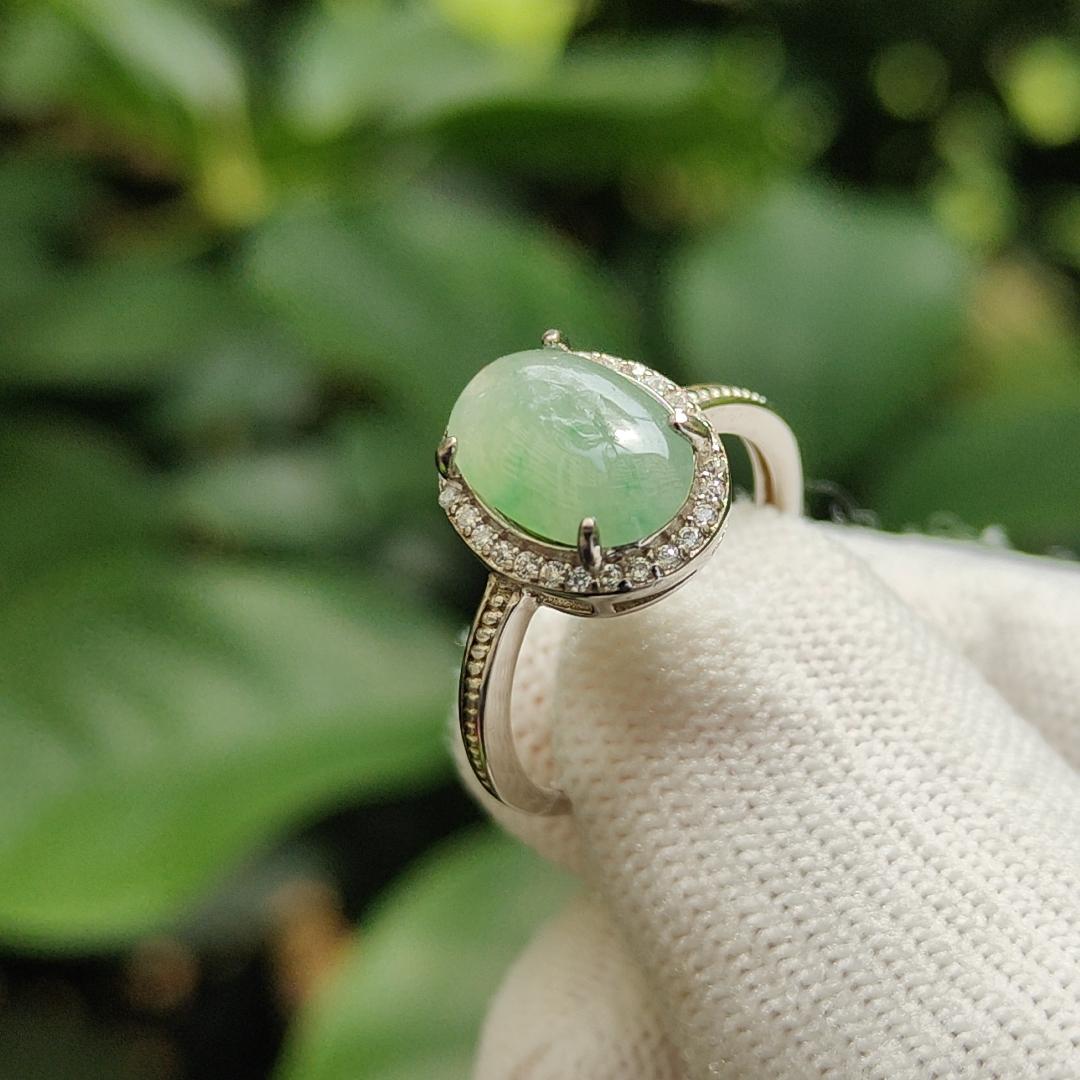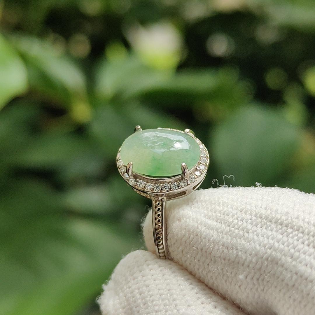 This exquisite Jade Ring features a Cabochon cut piece of Light Green Natural Type-A Jadeite-Jade, measuring 10.7 * 8 * 3mm.