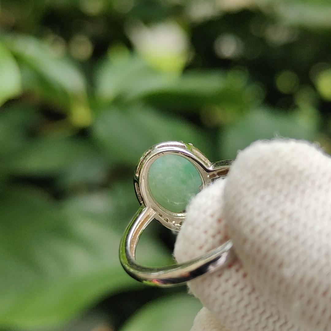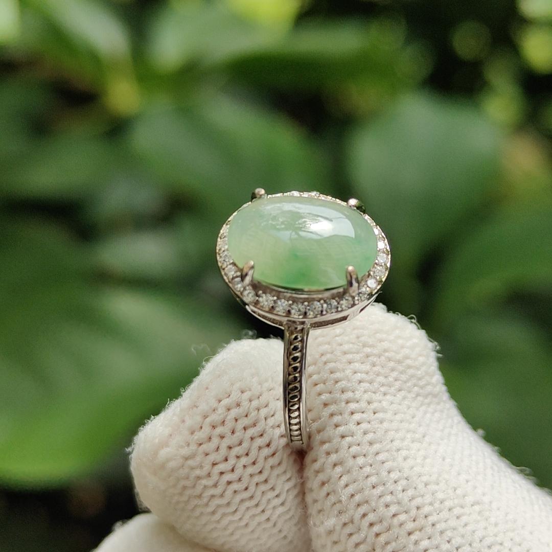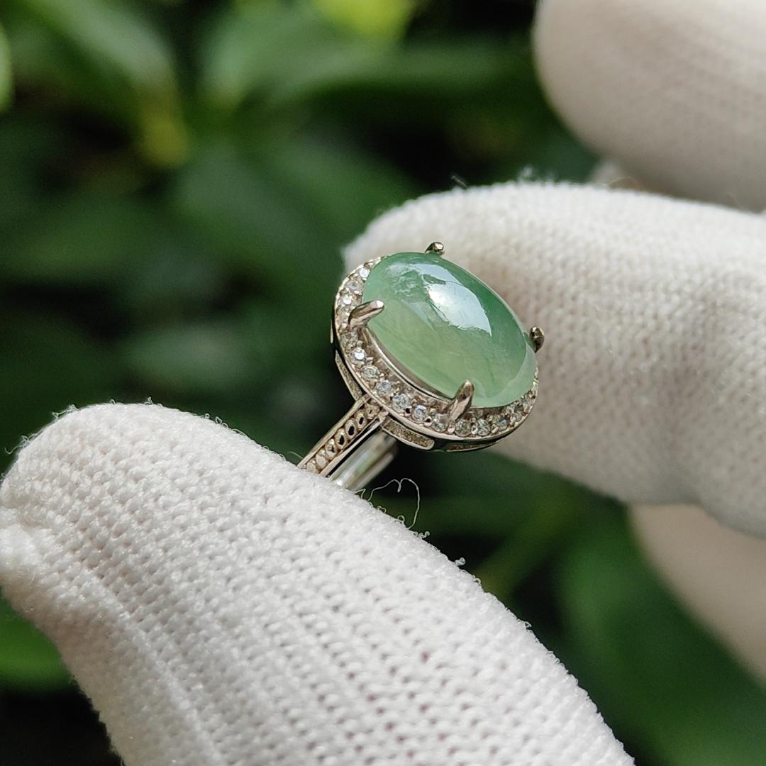This exquisite Jade Ring features a Cabochon cut piece of Light Green Natural Type-A Jadeite-Jade, measuring 10.7 * 8 * 3mm.