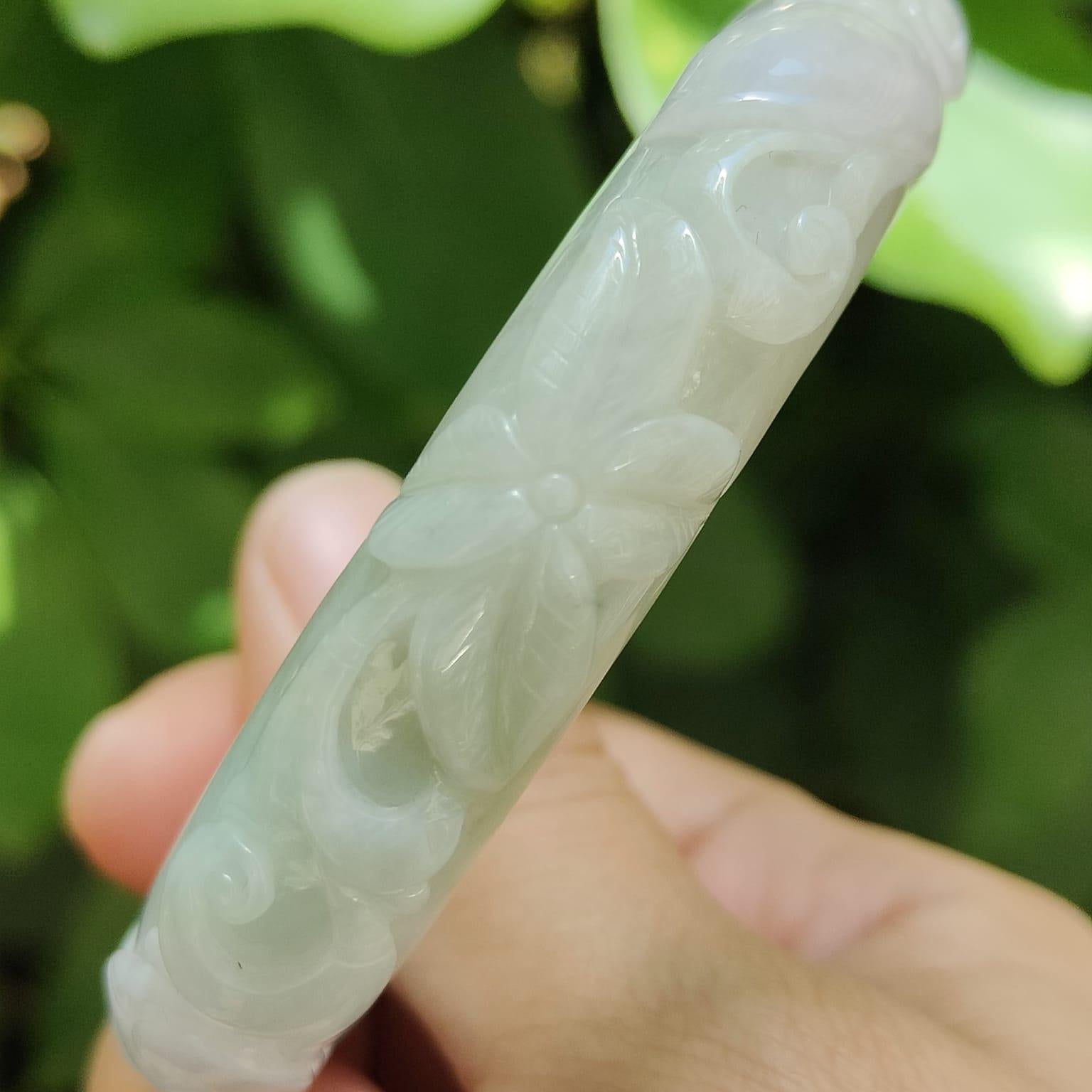 Embrace the dance of yin and yang with this exquisite Light Lavender and Light Green Natural Type A Jadeite Jade bangle. Handcrafted with floral and leaf patterns, each curve tells a story of growth and balance:
