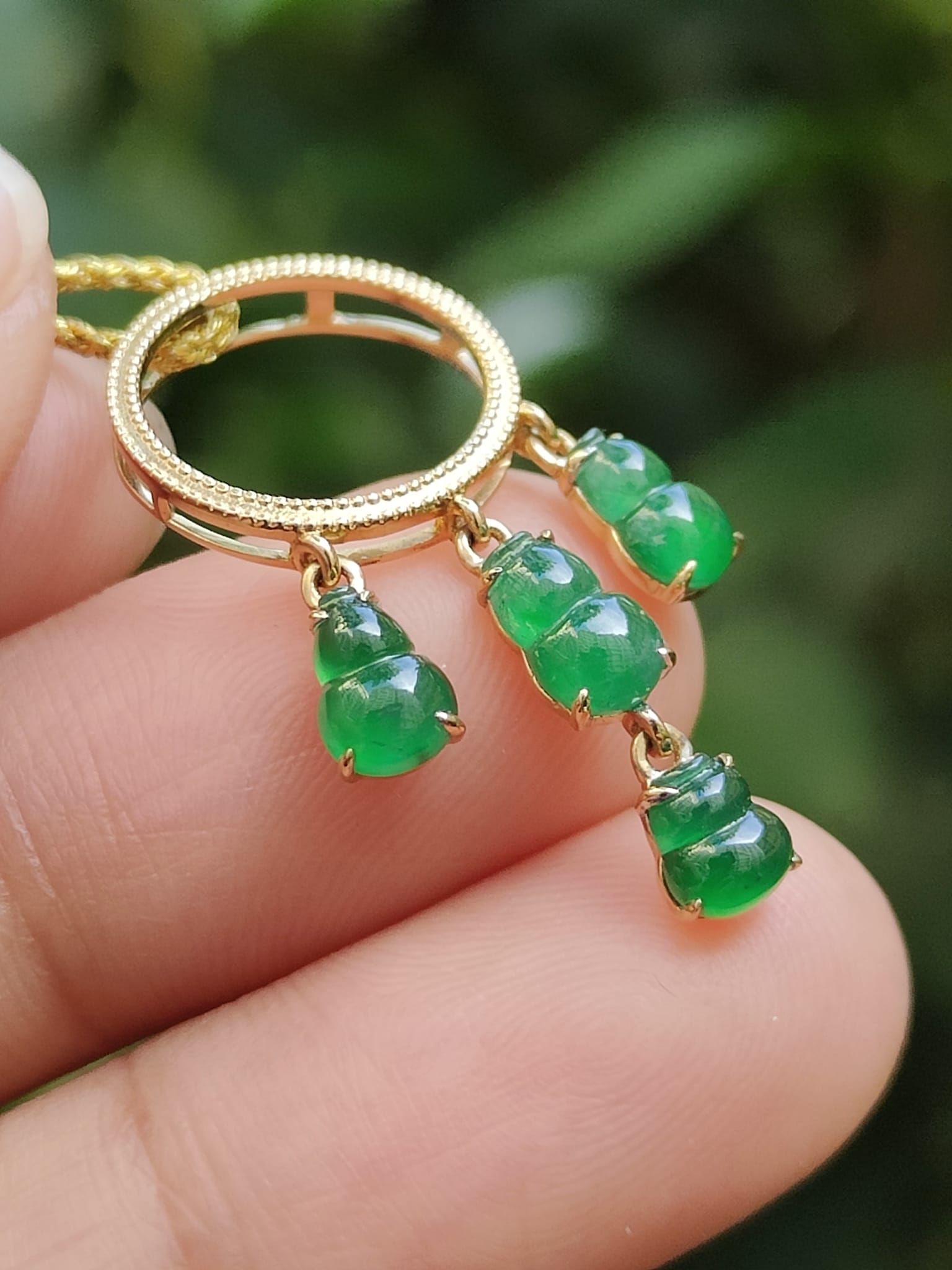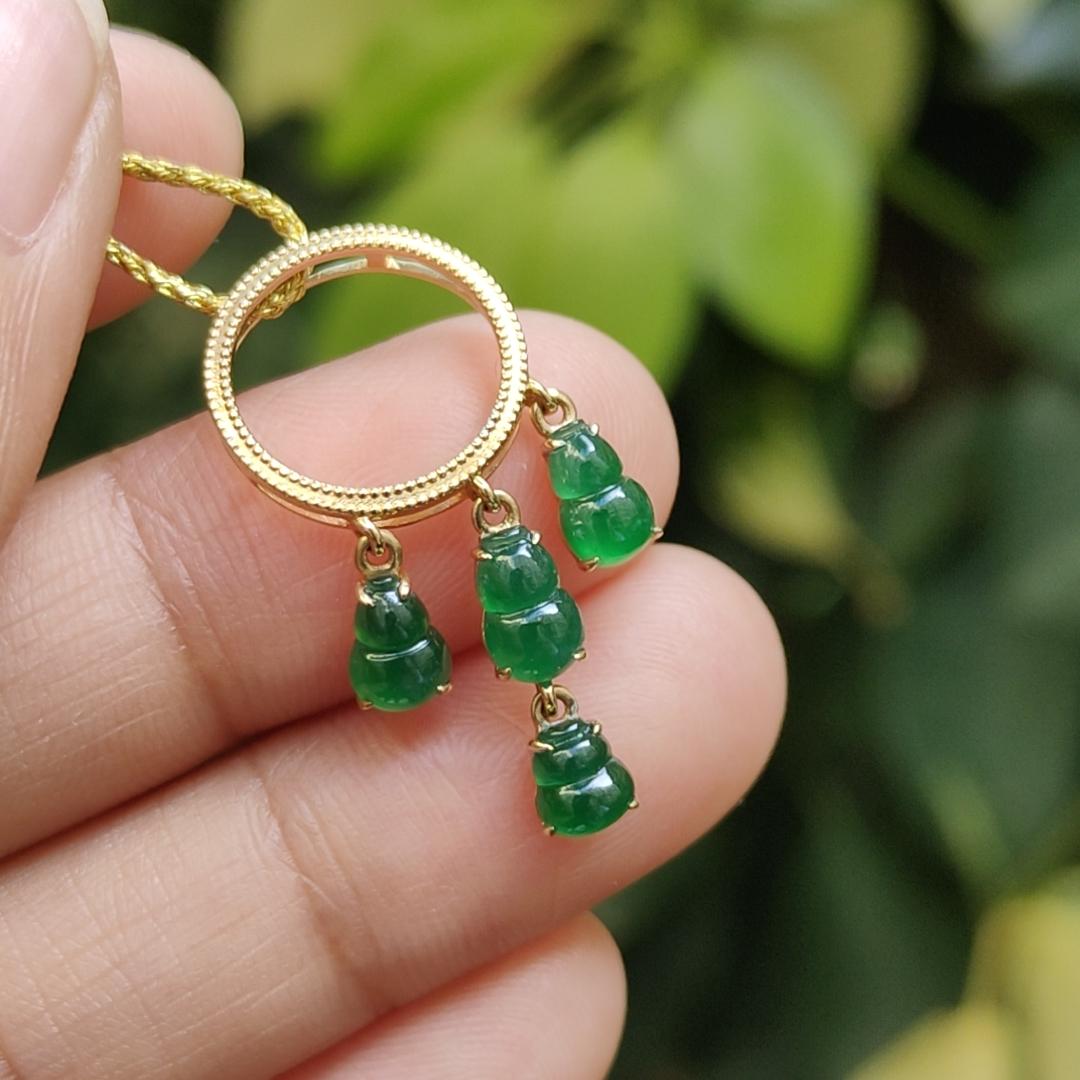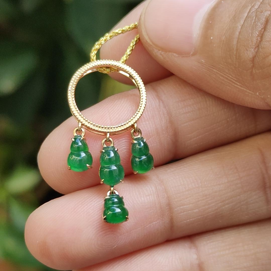 Discover the elegance of the Four Green Gourd Shape Natural Type A Jadeite Jade Pendant, beautifully set with 18k gold. This exquisite piece weighs 1.66 grams and comes with a certificate of authenticity.
