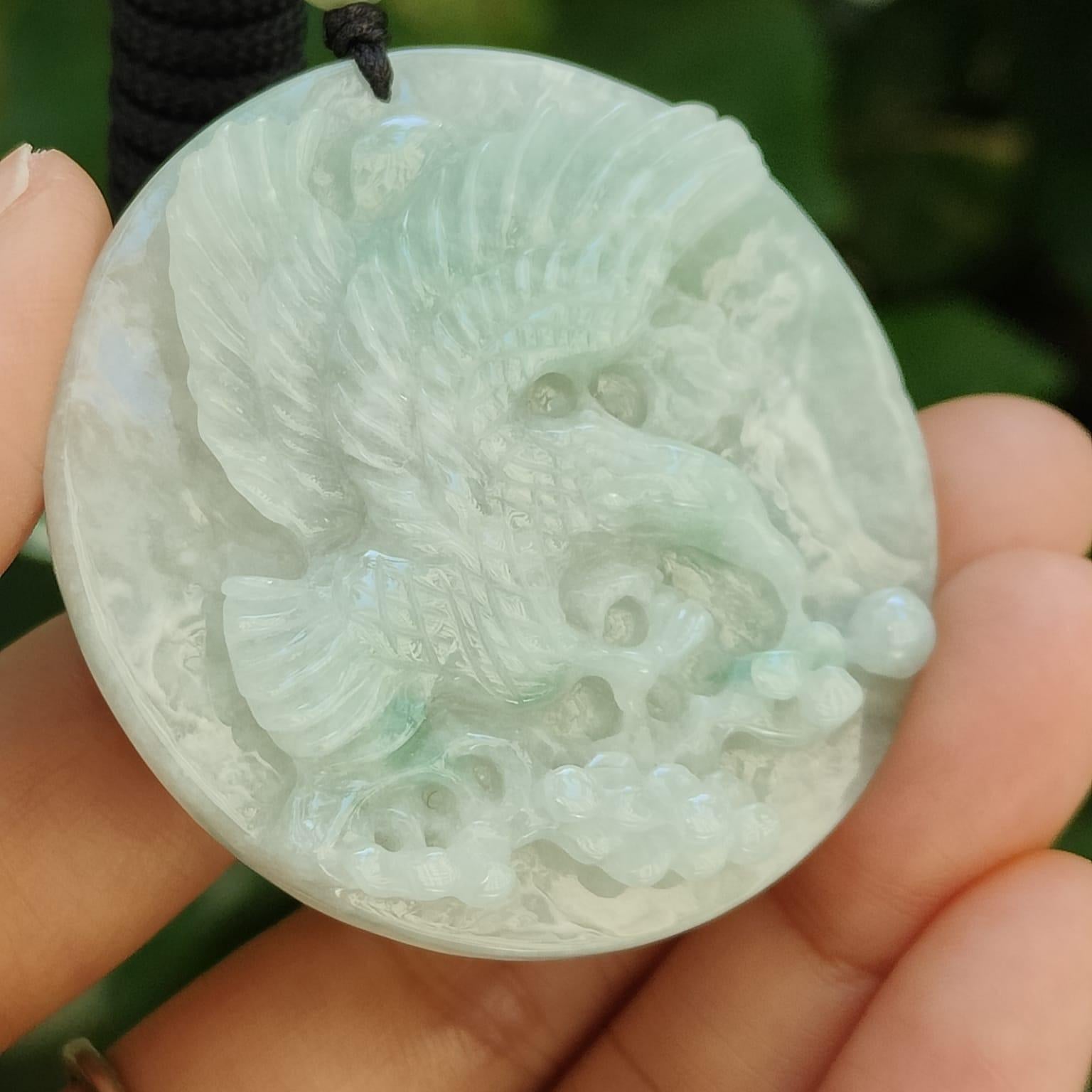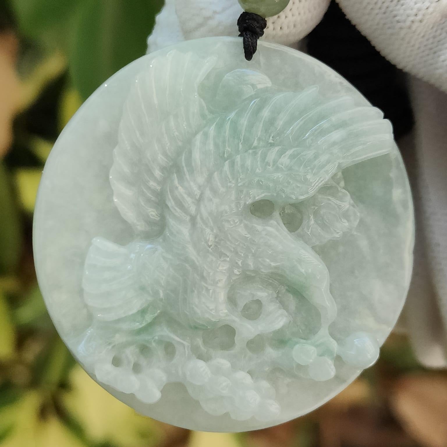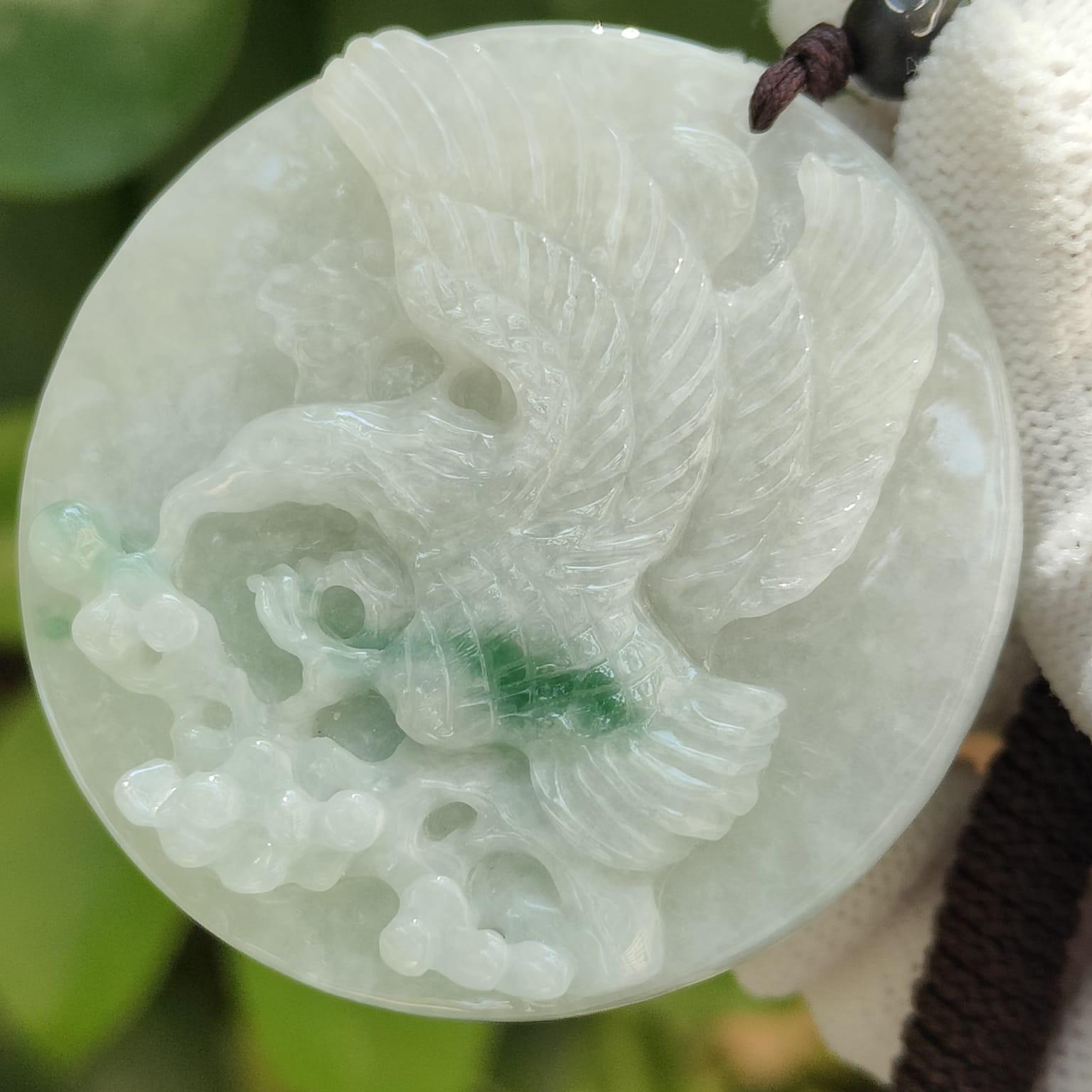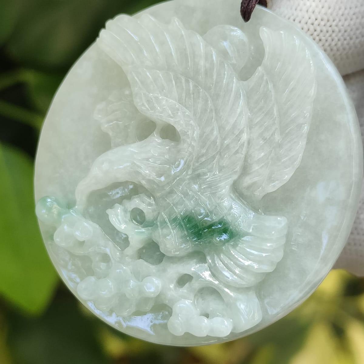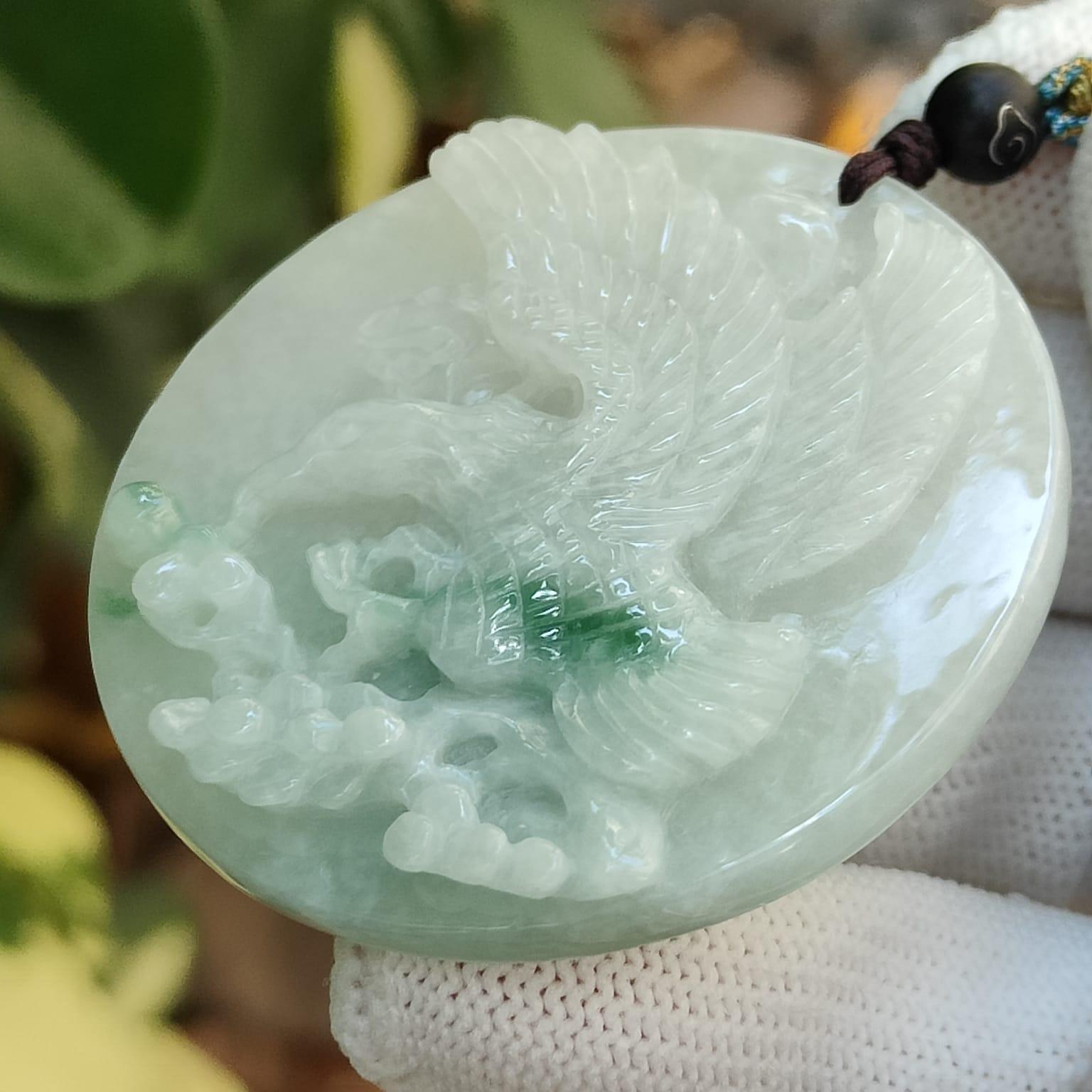 This isn’t just a pair of carvings—it’s a snapshot of 2019 craftsmanship. Machine-carved eagles frozen mid-flight, their wings textured by time (natural pits and cotton veins), gaze locked in eternal dialogue. The faint green streaks? Nature’s rebellious brushstrokes on 49mm Type A jadeite canvases.
