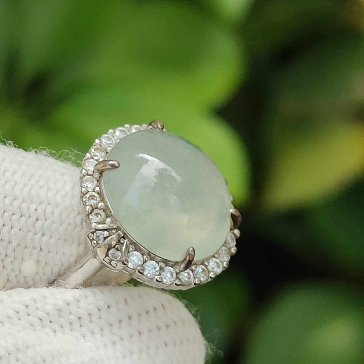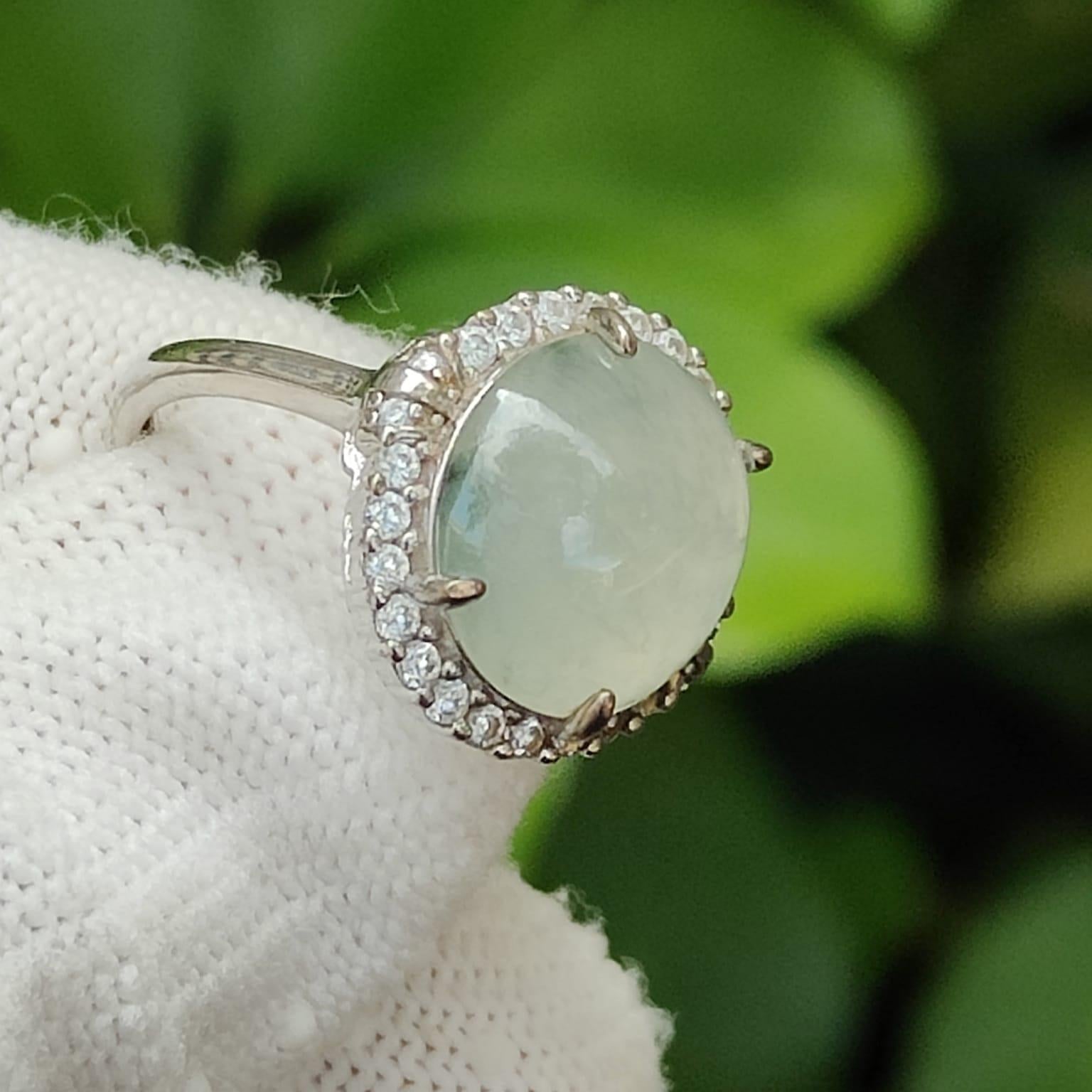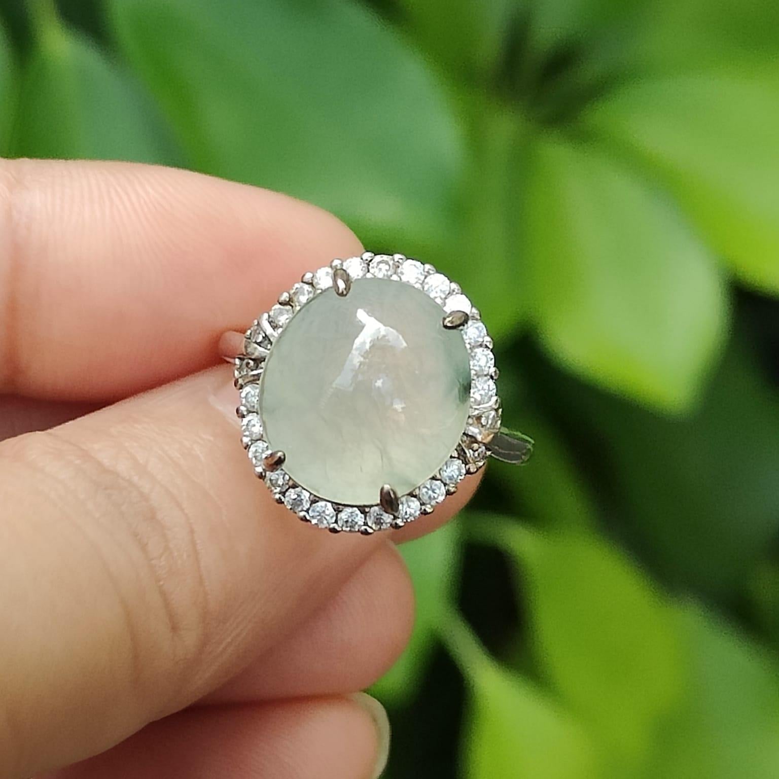 This high-grade icy jadeite, renowned for its crystal-clear transparency and fine texture, resembles the purity of ice, placing it among the mid-to-high-end varieties of jadeite. Set in an adjustable S925 sterling silver band, the jadeite is beautifully encircled by a halo of sparkling zircon stones, enhancing its luxurious appeal and adding a touch of modern sophistication.