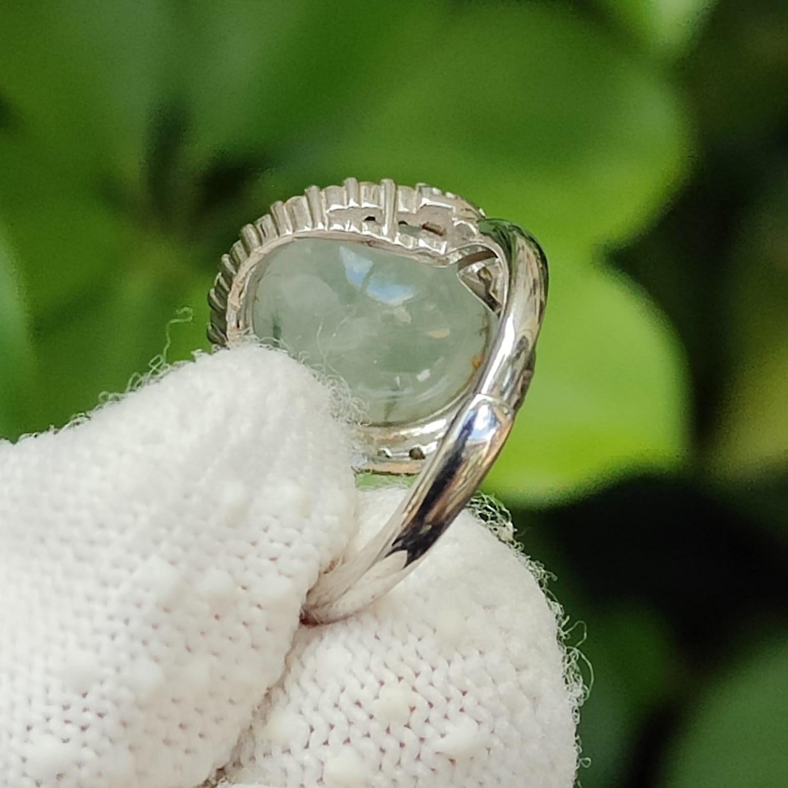 Experience the enchanting allure of the Icy Translucent Jadeite Blooming Elegance S925 Ring, a masterpiece featuring a premium Natural Type A Jadeite Jade cabochon. The centerpiece, measuring 13.3 x 11.6 x 4mm, showcases an icy translucent quality with a delicate floating light green flower (), a natural pattern that adds depth and charm.