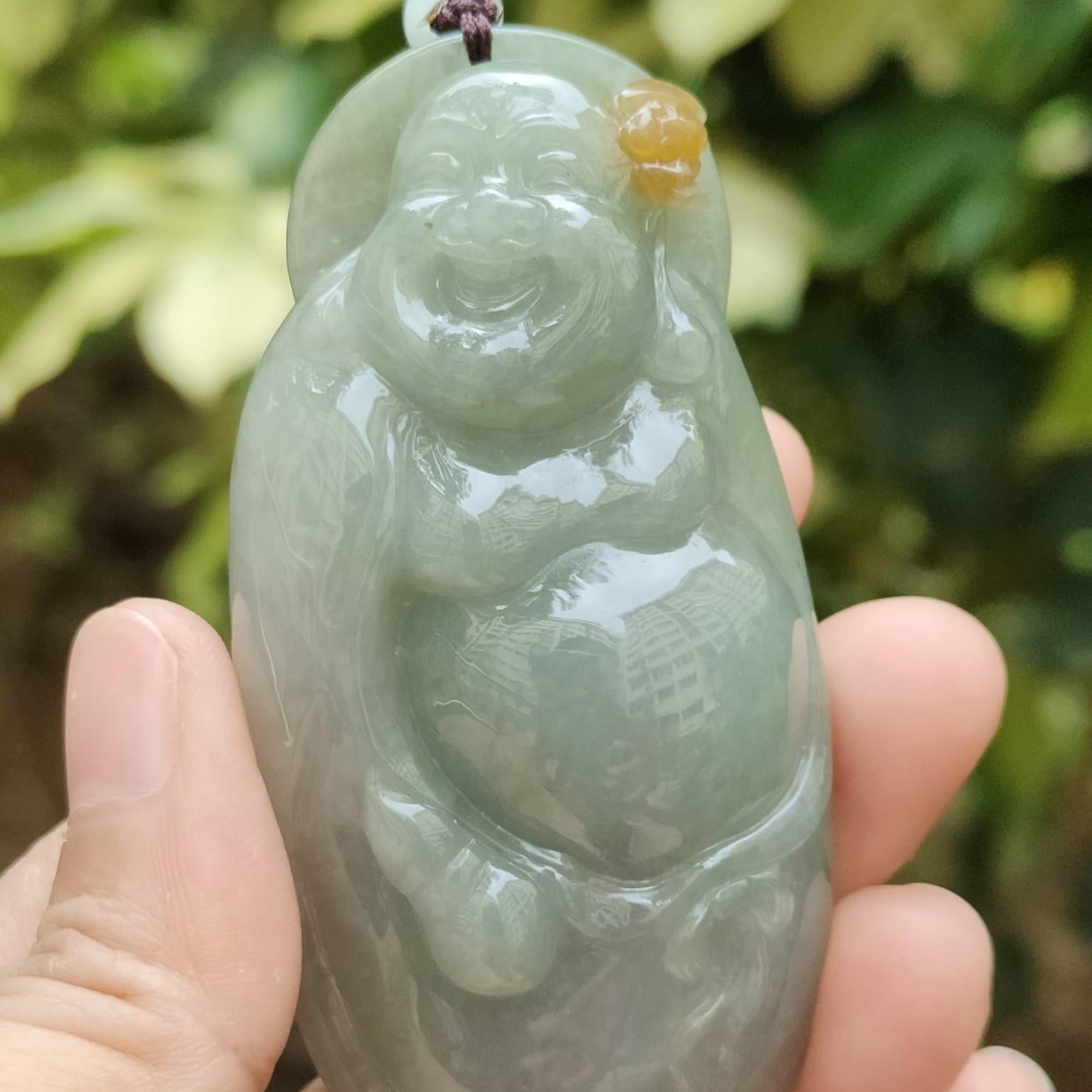This Laughing Buddha (‘Milo Buddha’) carving is a treasury of symbolism. Carved from rare light green and golden-yellow Type A jadeite (67.13g), every detail whispers harmony: