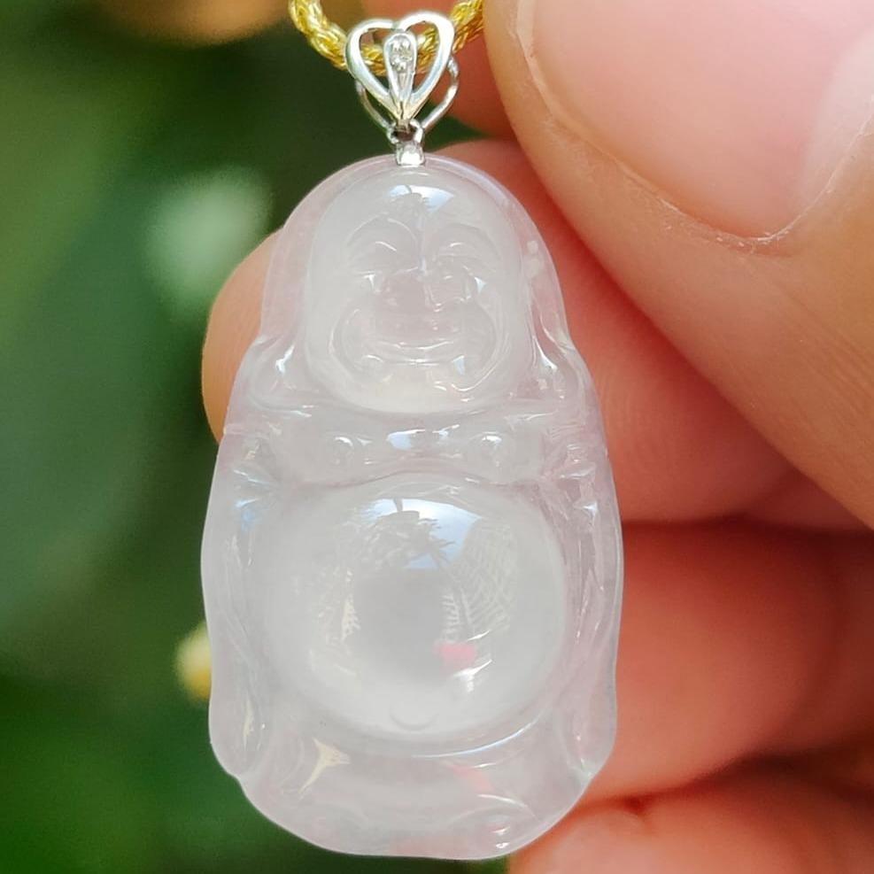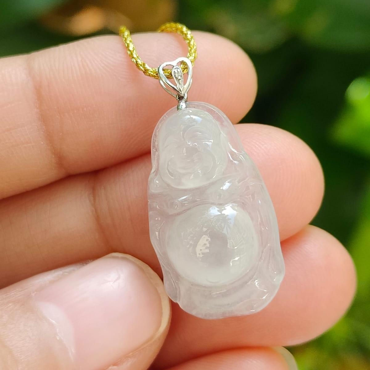 This pendant holds more than a laughing Buddha—it holds balance. Carved from icy Type A jadeite, its belly becomes a cosmic canvas reflecting your surroundings, while the 18K gold clasp anchors it in the Five Elements:⛰💧🔩🌍🔥