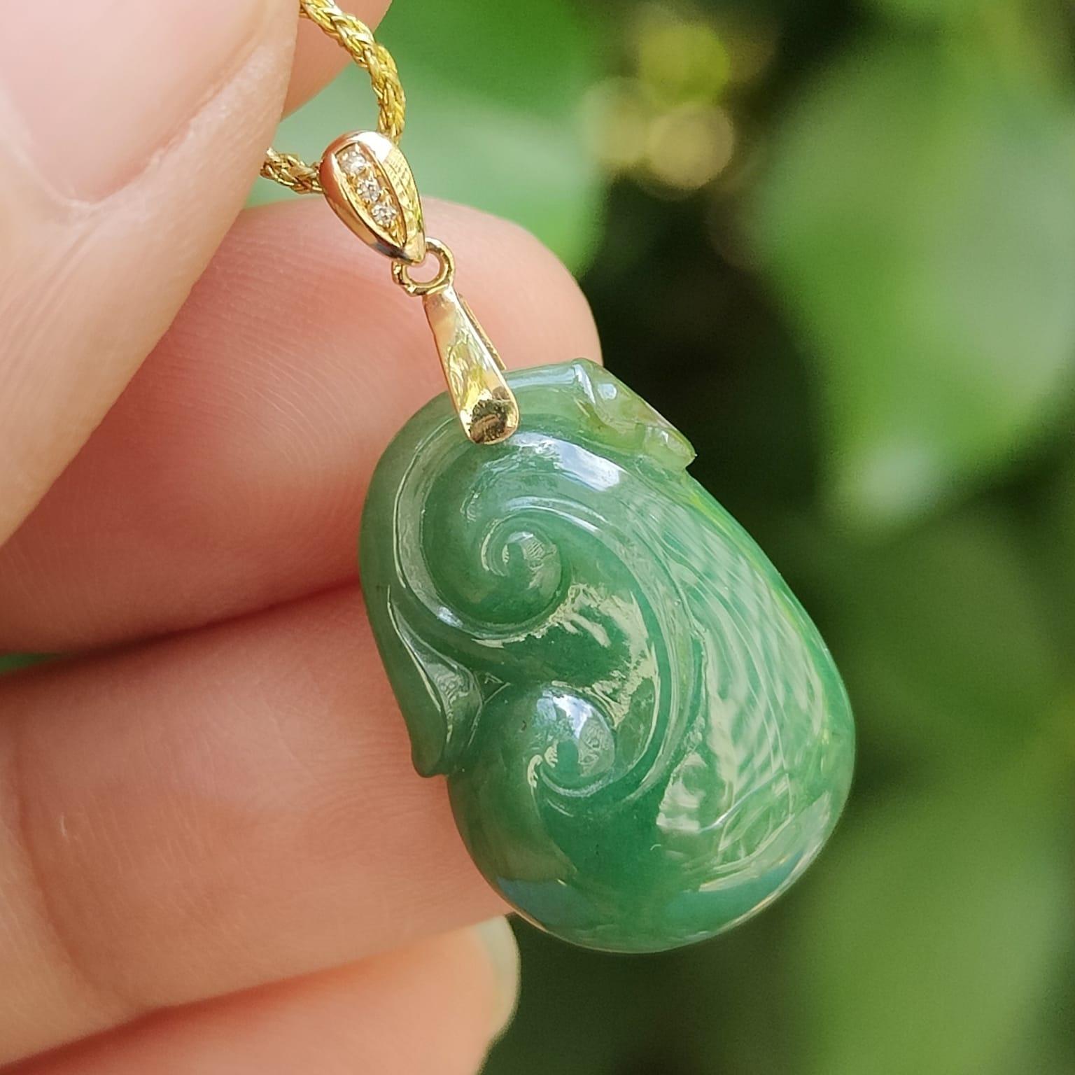 This isn’t just a pendant—it’s a conversation with time. Carved from rare Myanmar green jadeite, its 19.6mm Ruyi shape has journeyed from ancient mines to your hands, polished to a mirror finish that captures fleeting moments: a passing cloud, a city’s pulse, a tree’s whisper. The 18K gold clasp (0.8g), studded with diamonds, isn’t merely a fastener—it’s a bridge between earth’s raw beauty and human artistry.