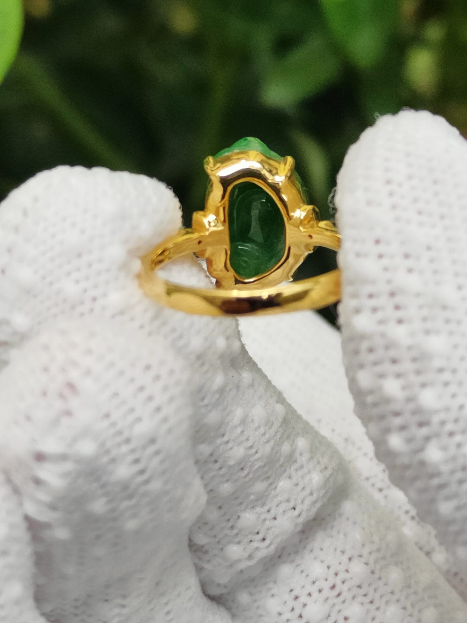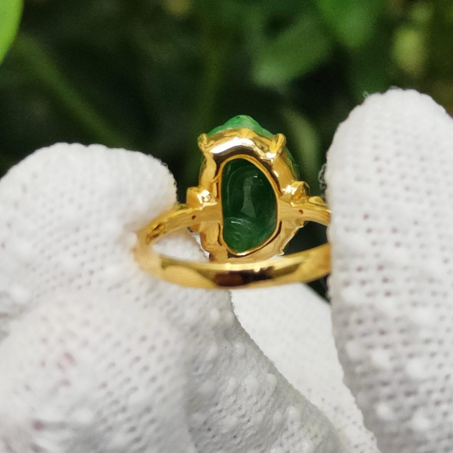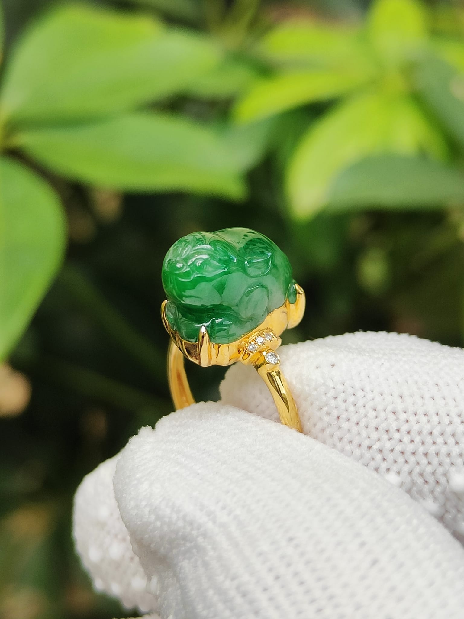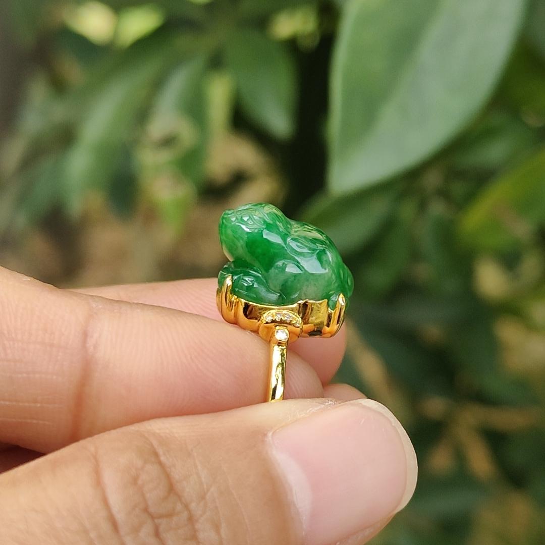 Discover the exquisite Three Legs Toad Green Natural Type A Jadeite Jade ring, beautifully crafted with 18k gold. This unique piece is both a statement and a symbol of prosperity.