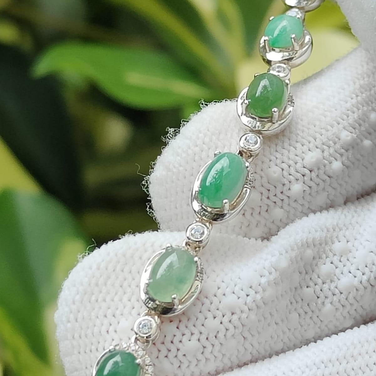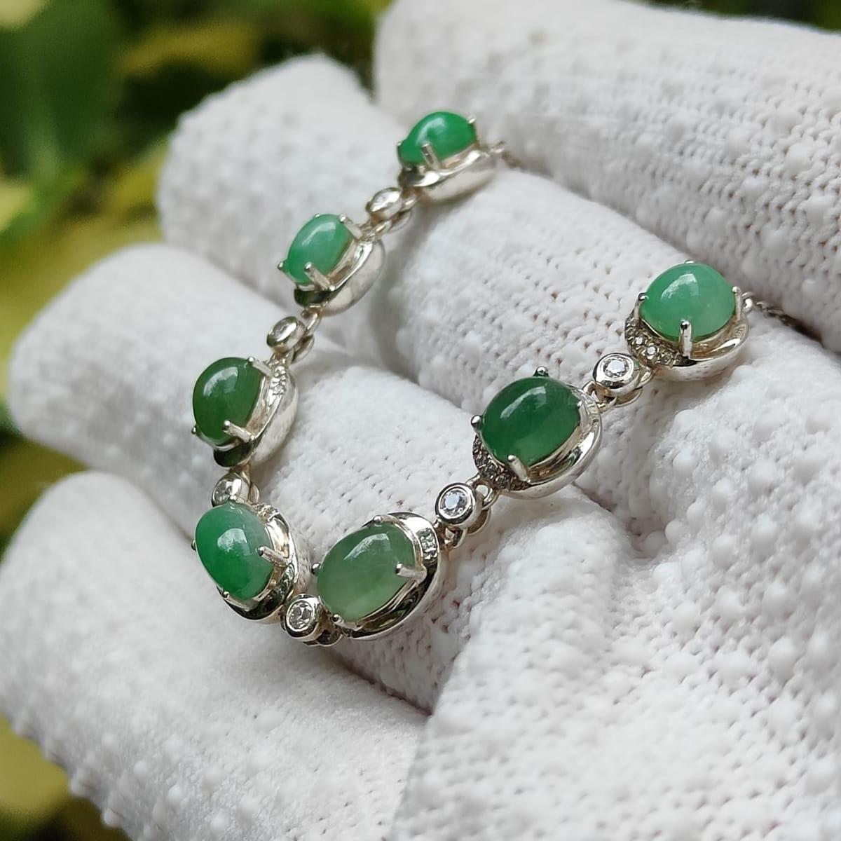 Introducing the Verdant Harmony Jadeite Cabochon Bracelet, a stunning piece featuring seven Natural Type A Jadeite Jade cabochons set on an S925 sterling silver bracelet.
