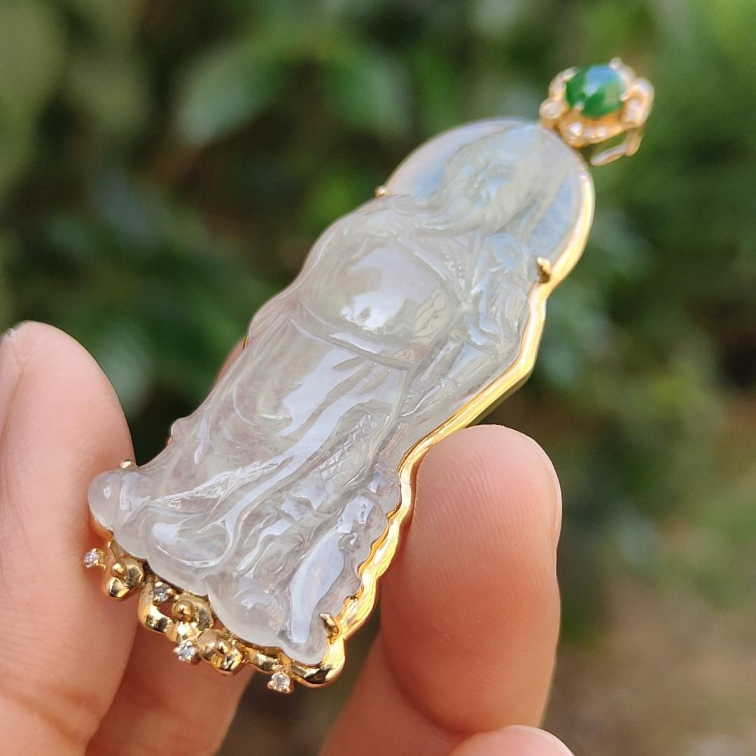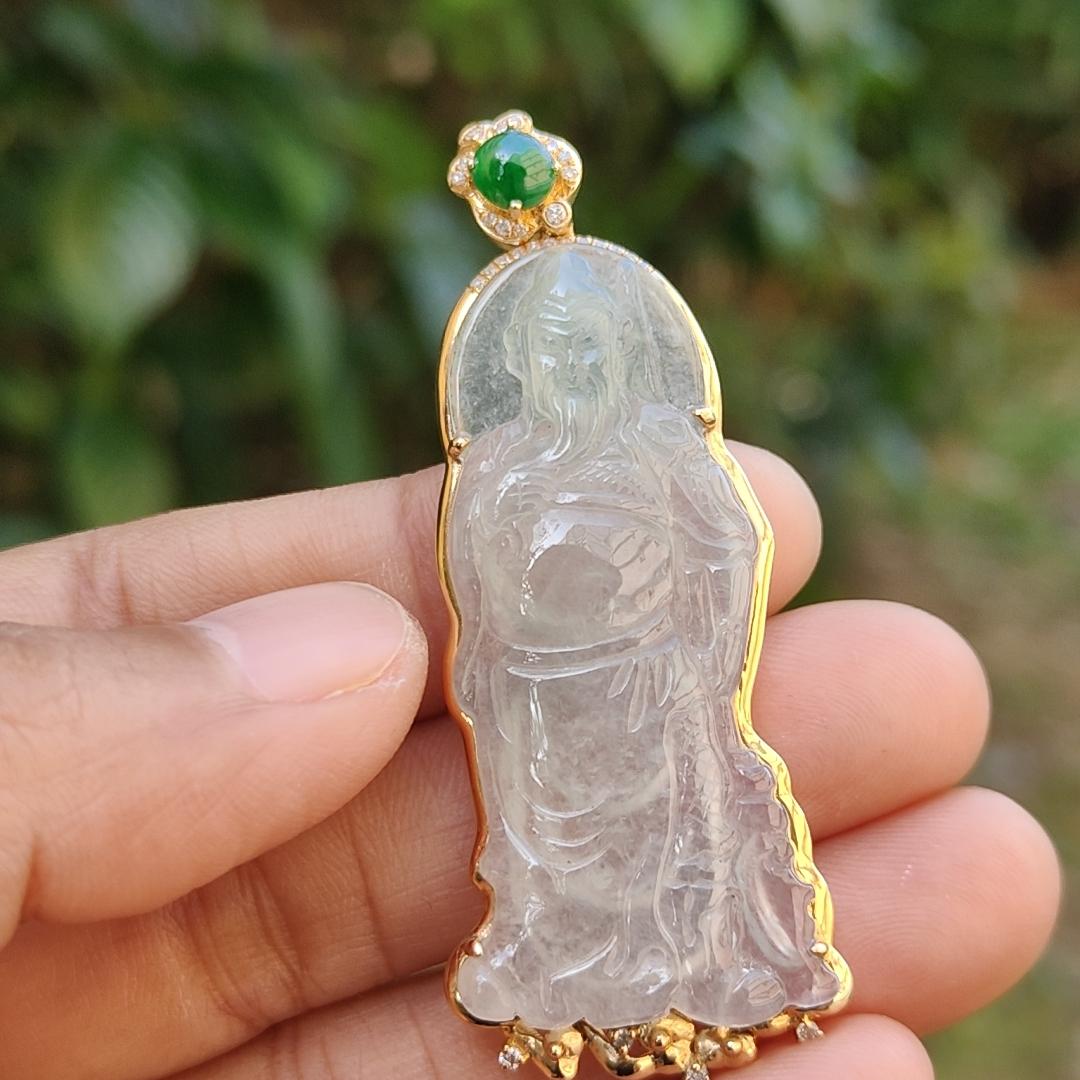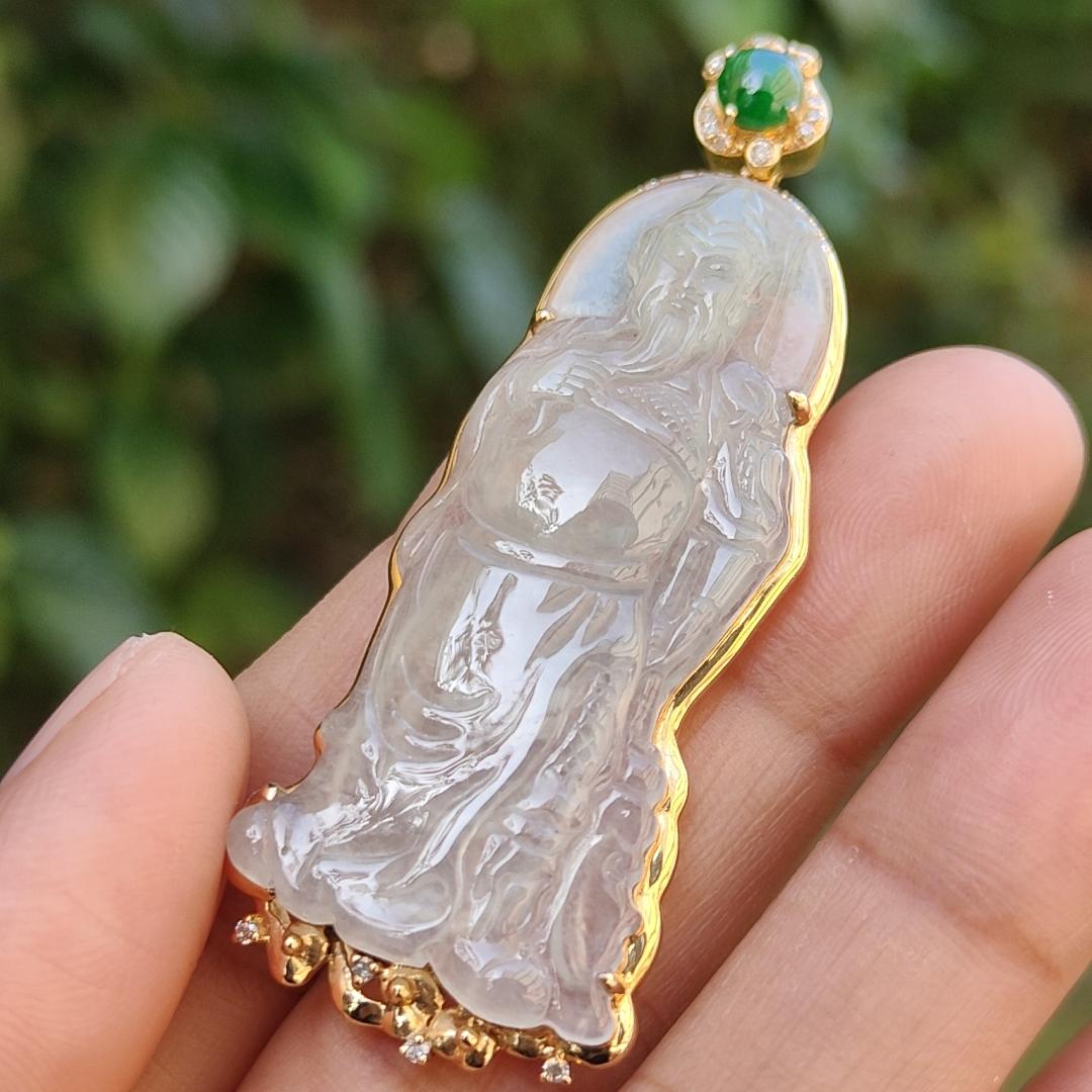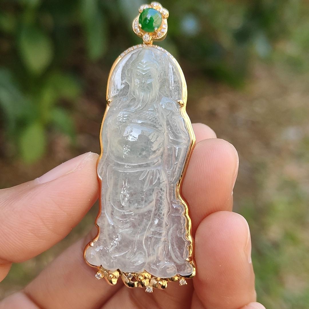 This exquisite pendant features a high-quality light green and green cabochon icy translucent natural Type A Jadeite Jade, expertly crafted as Guan Gong and set on 18k Gold.