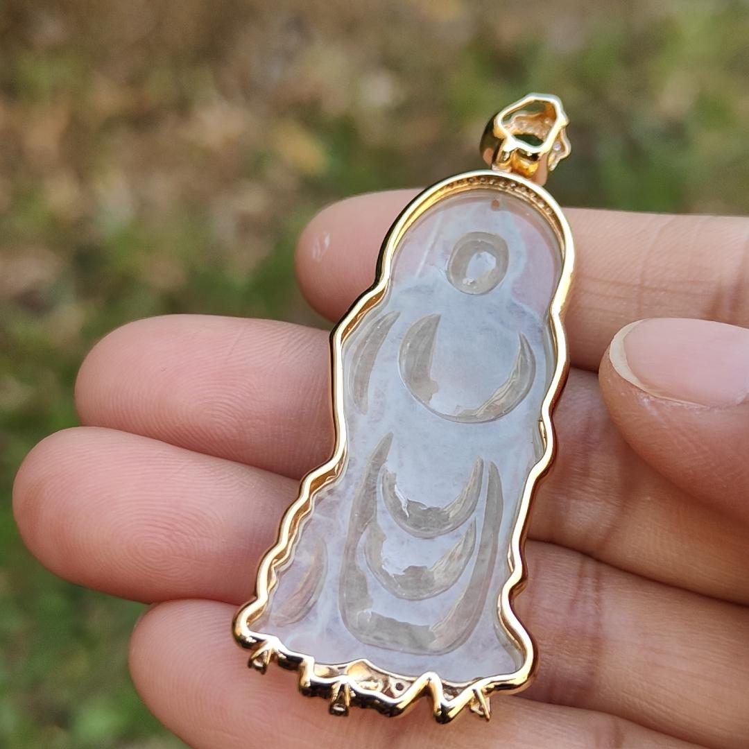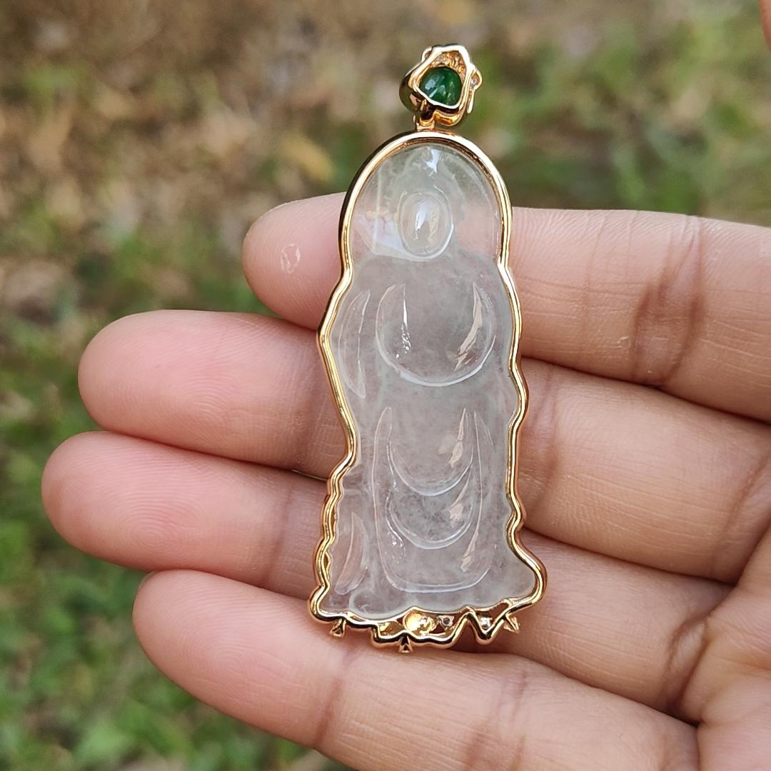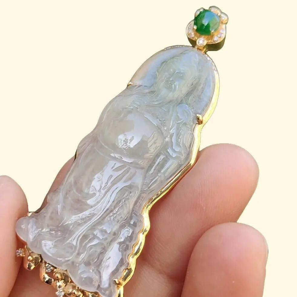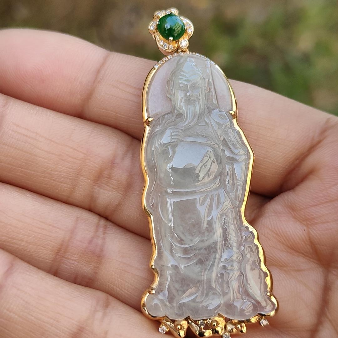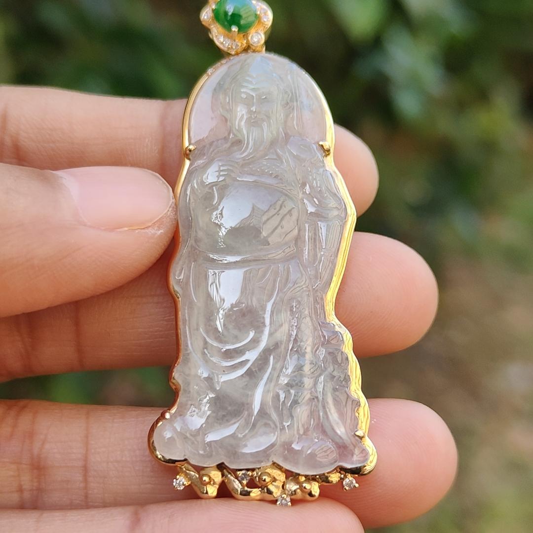 This exquisite pendant features a high-quality light green and green cabochon icy translucent natural Type A Jadeite Jade, expertly crafted as Guan Gong and set on 18k Gold.