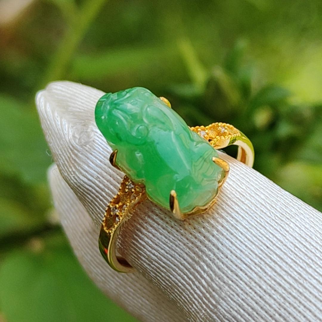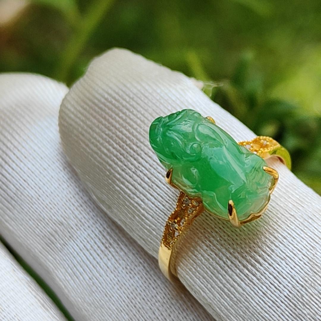 Pixiu வடிவில் வடிவமைக்கப்பட்ட பச்சை இயற்கை வகை A Jadeite மோதிரத்துடன் கூடிய இந்த நேர்த்தியான ஃபைன் ஜூவல்லரி 18k தங்க அமைப்பைக் கொண்டு உங்கள் ஸ்டைலை உயர்த்துங்கள். மோதிரத்தின் அழகிய வடிவமைப்பு 2.05 கிராம் எடையுள்ள வைரங்களால் மேலும் மேம்படுத்தப்பட்டுள்ளது.