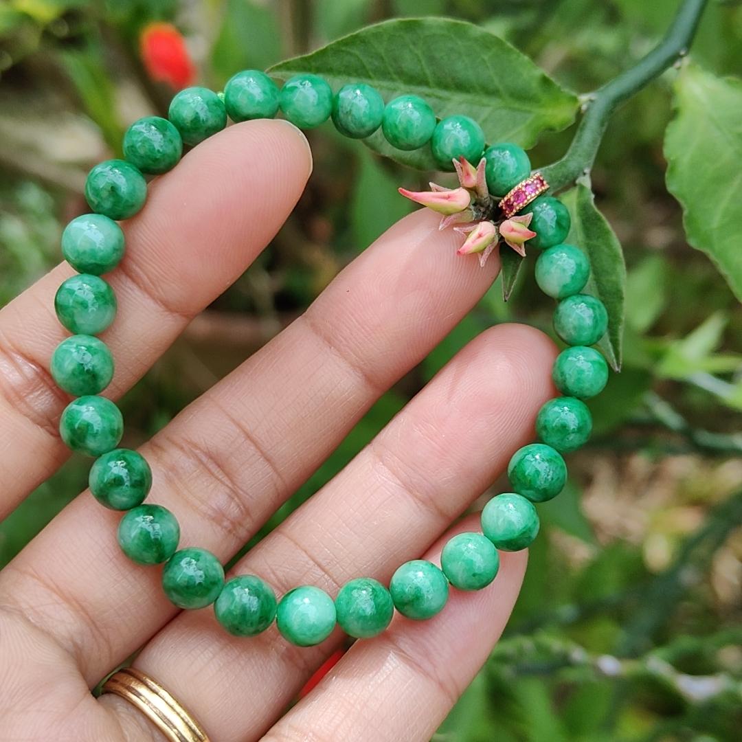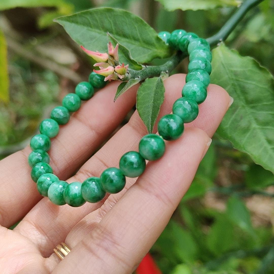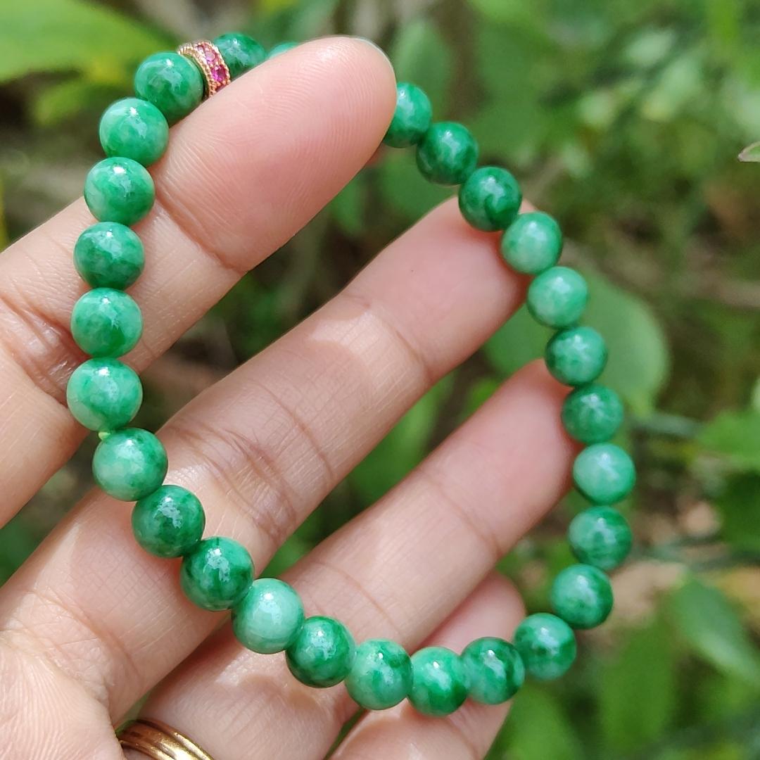 இயற்கையான வகை A ஜேடைட்டால் செய்யப்பட்ட இந்த பிரீமியம் தரமான காரமான-பச்சை வளையல் 6.5 மிமீ அளவீட்டு அளவுடன் 28 அற்புதமான பச்சை மணிகளைக் கொண்டுள்ளது. 12.75 கிராம் எடையுள்ள இந்த வளையல் வேலைக்காகவோ அல்லது கூட்டமாக இருந்தாலும் சரி, தினசரி அணிவதற்கு ஏற்ற துணைப் பொருளாகும்.