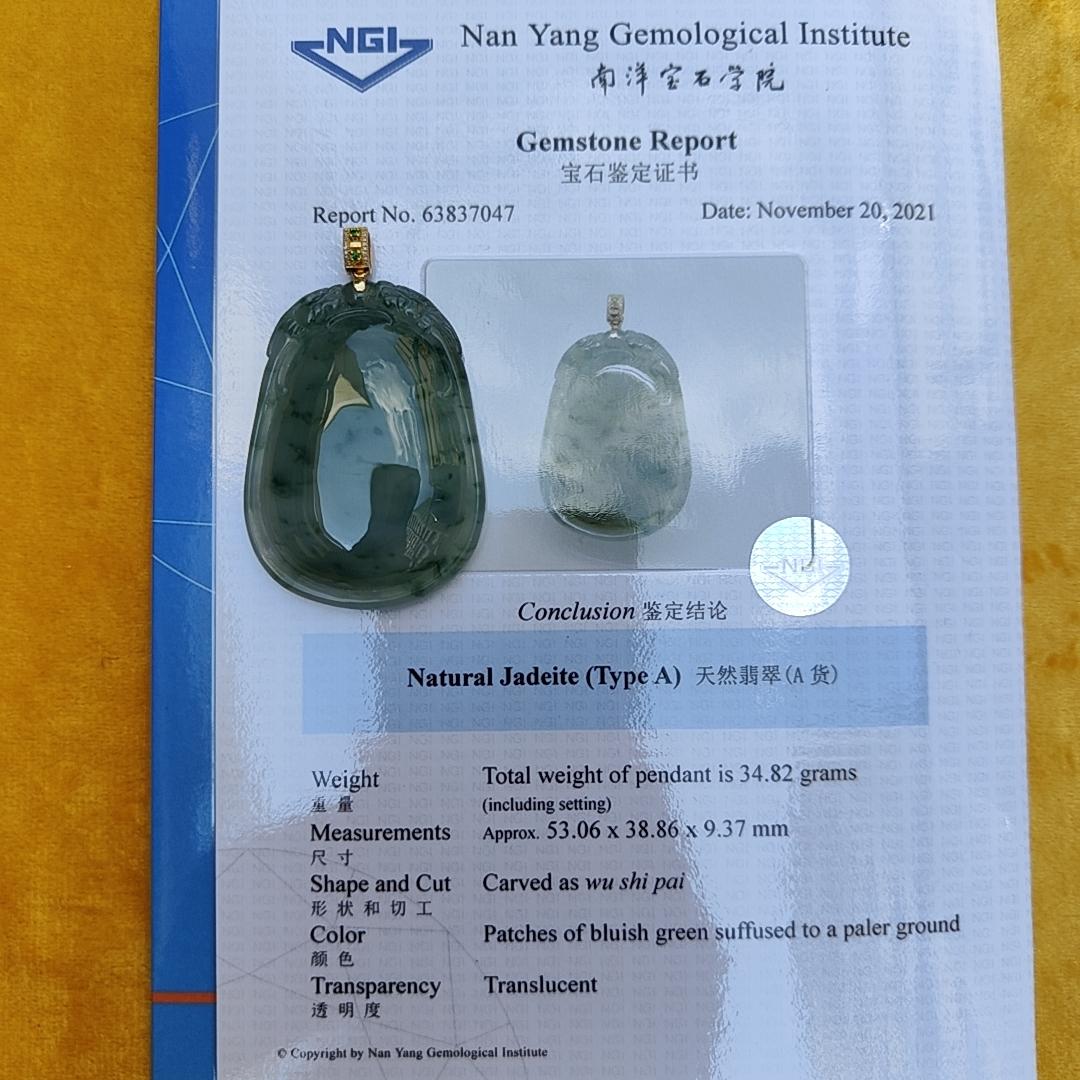 - คุณภาพพรีเมี่ยม: This Natural Type A Jadeite necklace comes with an NGI Gemstone report carved as wu shi pai, ensuring its authenticity and quality.