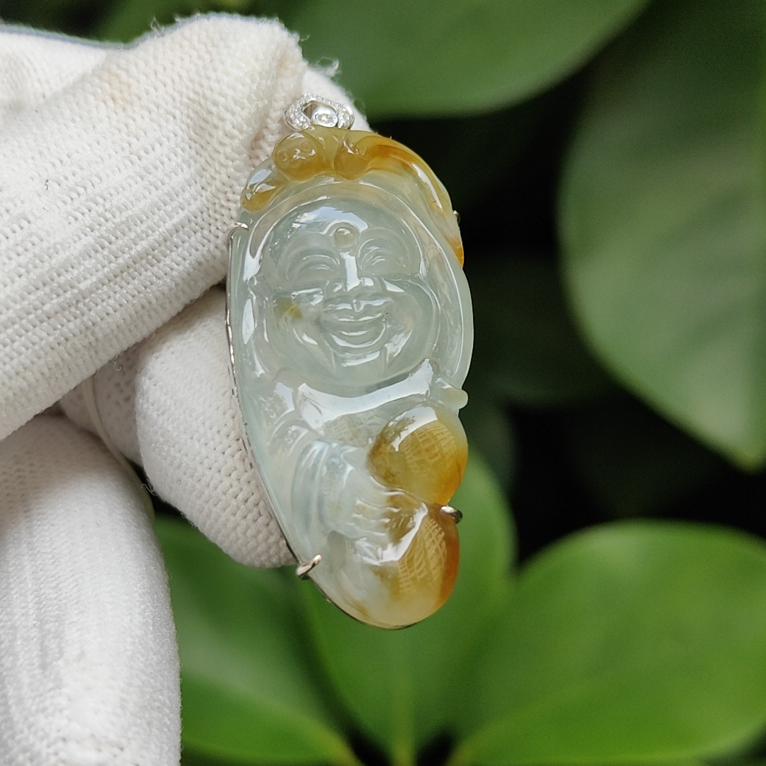 Mặt dây chuyền tinh xảo có hình Phật Di Lặc được chế tác tỉ mỉ từ ngọc bích vàng loại A tự nhiên trong mờ, được dát trang trí tinh xảo bằng vàng 18k, tạo nên một món đồ trang sức tuyệt đẹp tôn lên vẻ đẹp của ngọc bích. —> Tìm hiểu thêm Nhấp vào đây