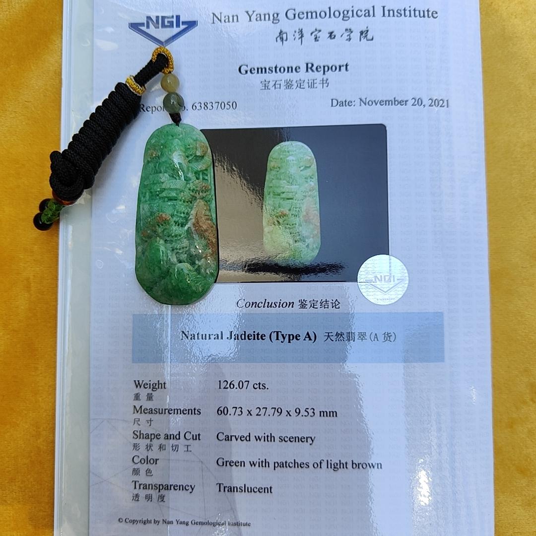 Mặt dây chuyền Jadeite tự nhiên trong suốt màu xanh lá cây với các mảng màu nâu nhạt này là một phụ kiện trang sức tuyệt đẹp sẽ tôn lên phong cách của bạn. Sản phẩm đi kèm với báo cáo đá quý NGI đảm bảo tính xác thực và nặng 126,07 gram.