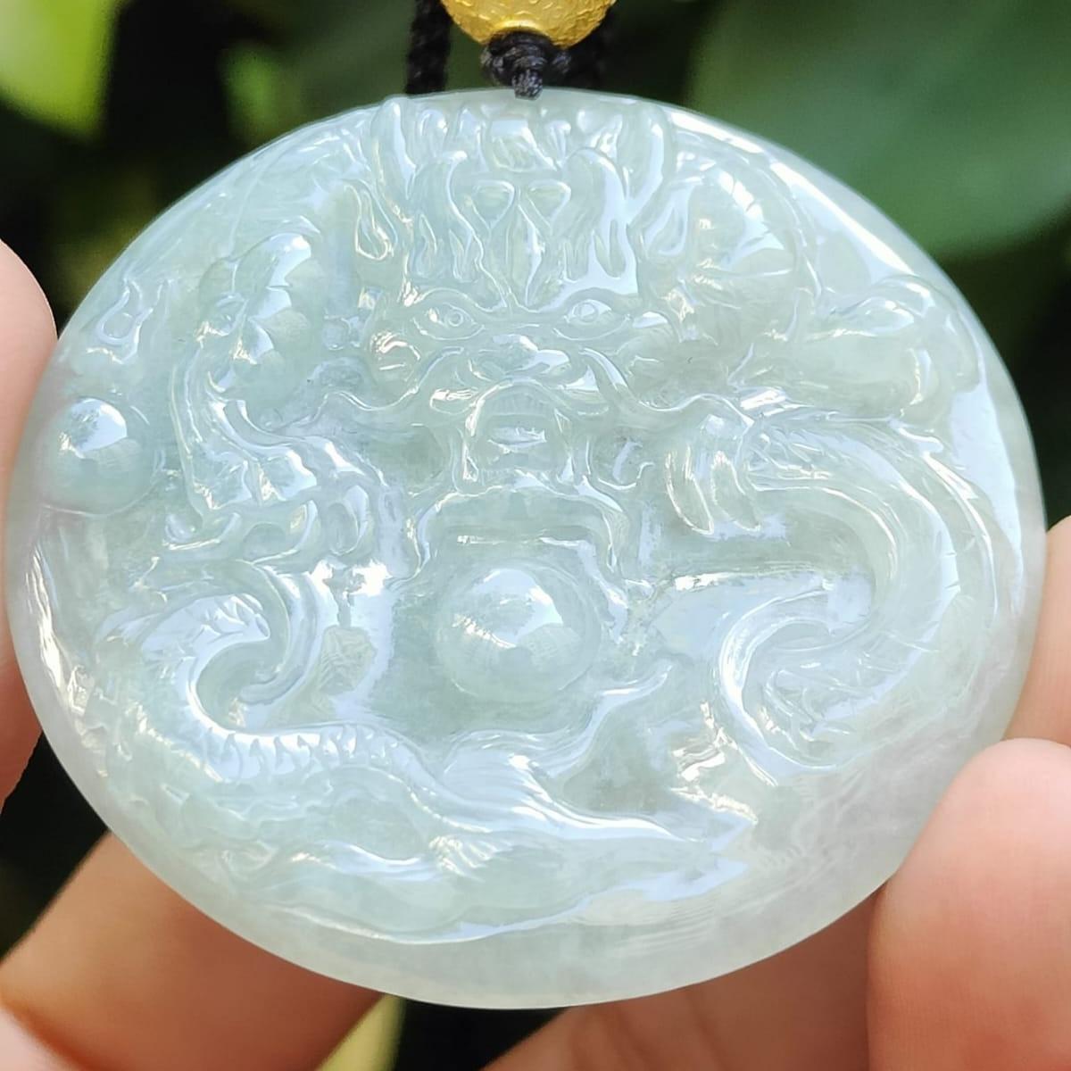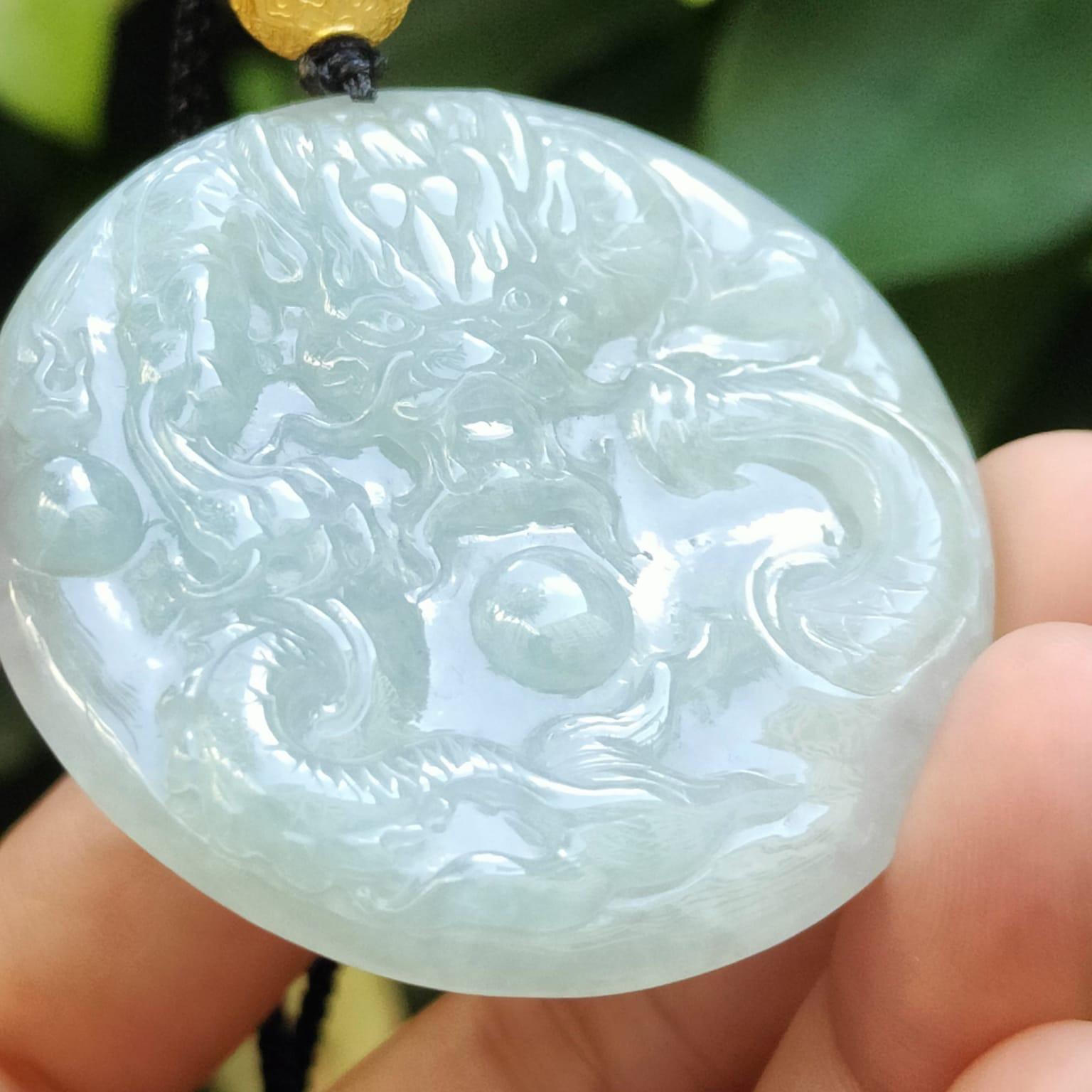 This exquisite Round Shape Dragon Pendant is crafted from Natural Type A Jadeite Jade and features a stunning 18k bead. Perfect for daily wear, this unique piece of jewelry combines elegance with a touch of cultural significance.   Certificate numbers: 910469017476 [Please note that 18k Gold bead was added after our company collection as we think it is nicer – diy tie with a rope clasp can easily attached with other chain or rope as necklace]