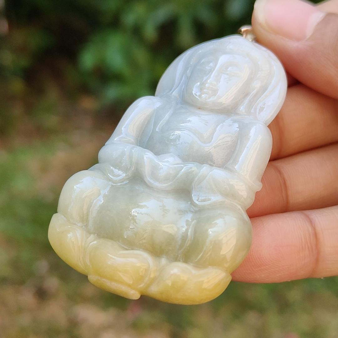 Nâng cao vẻ ngoài hàng ngày của bạn với Mặt dây chuyền Guanyin màu vàng và trắng này được làm từ Jadeite loại A tự nhiên từ Myanmar. Nặng 25,08 gam và có kích thước 59,1 * 38,6 * 7 mm, mặt dây chuyền này hoàn hảo để bạn đeo hàng ngày.