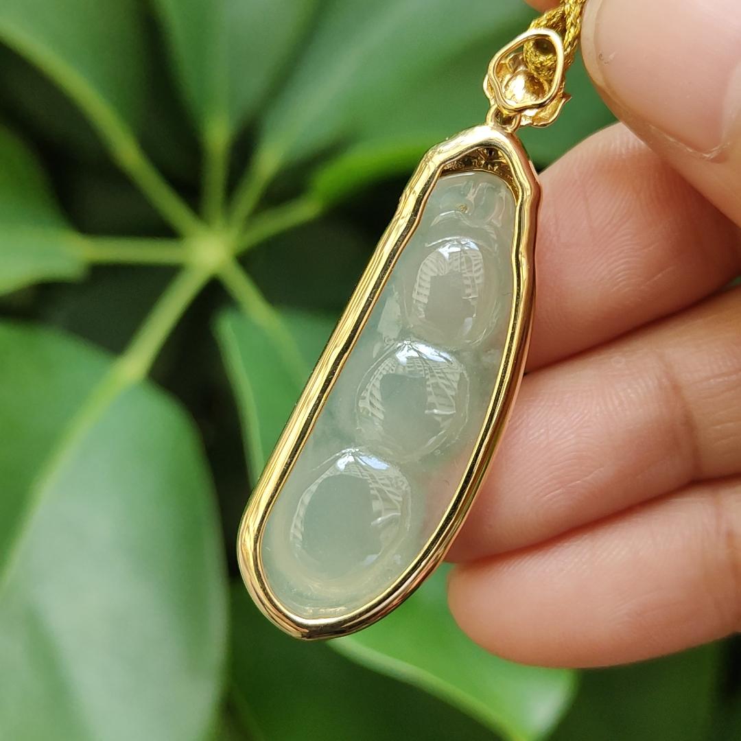 这款高品质天然 A 型翡翠玉吊坠项链呈现良好的半透明浅绿色色调,呈豆形并镶嵌在 18k 金上。