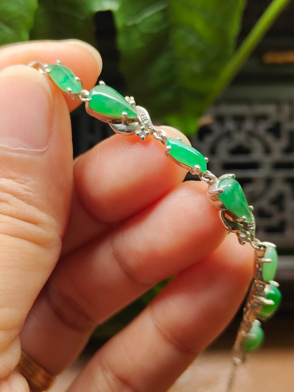 七颗天然 A 型绿色凸圆形翡翠手链,让您尽享优雅。这款精美手链采用七颗令人惊叹的凸圆形翡翠,镶嵌在高品质 S925 银中。